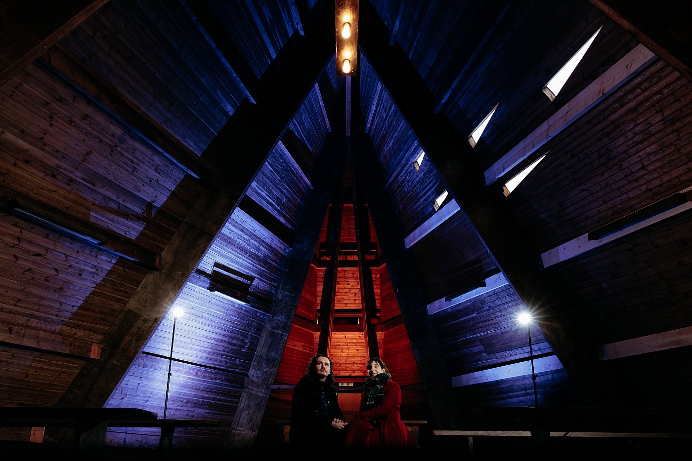Comme vous pourrez le découvrir sur la dernière photo de cette série à la chapelle, nous obtenons une incroyable photo des mariés, mis en valeur par la géométrie étonnante de la bâtisse et les lumières créées à l'aide des différents flashs utilisés.