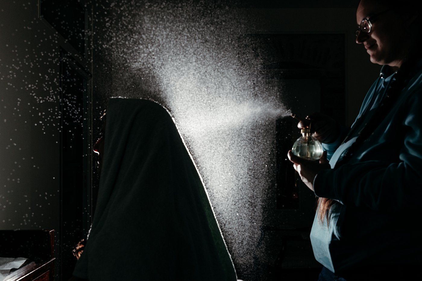 Ici, il va falloir faire en sorte que les gouttelettes du spray de laque soient bien visibles. Je vais donc placer un flash en contre-jour, derrière le visage de notre mariée improvisée.