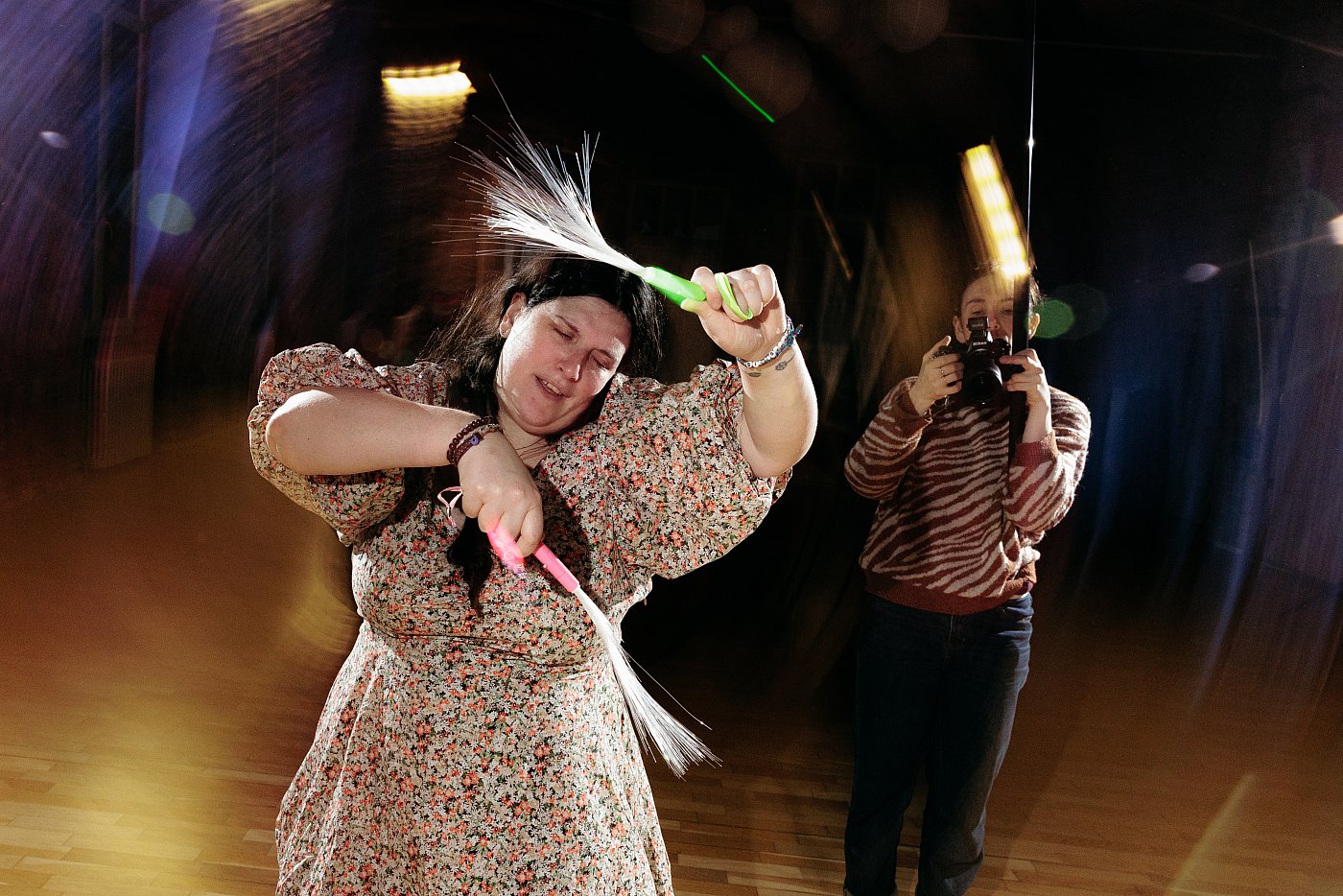 L'idée était la suivante : imaginons que nous n'avons pas eu le temps de photographier le traditionnel lancer de bouquet lorsqu'il faisait encore jour et que nous devons rattraper le coup à l'intérieur, l'action devant être entièrement éclairée au flash !