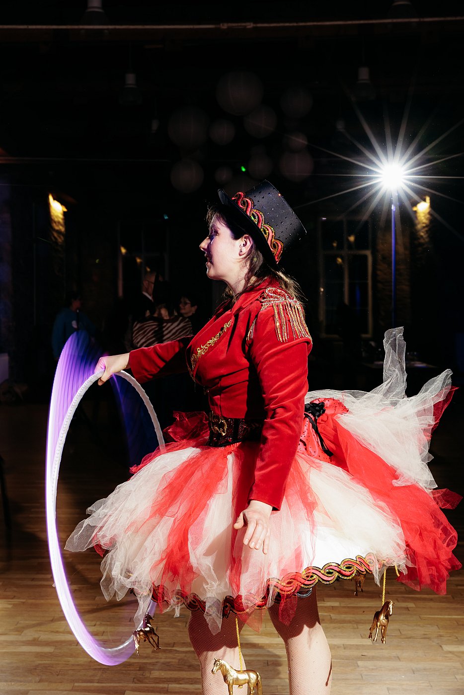 La dame, qui officiait tout à l'heure durant le show burlesque, était cette fois sur la piste de danse et jonglait avec un cerceau lumineux.