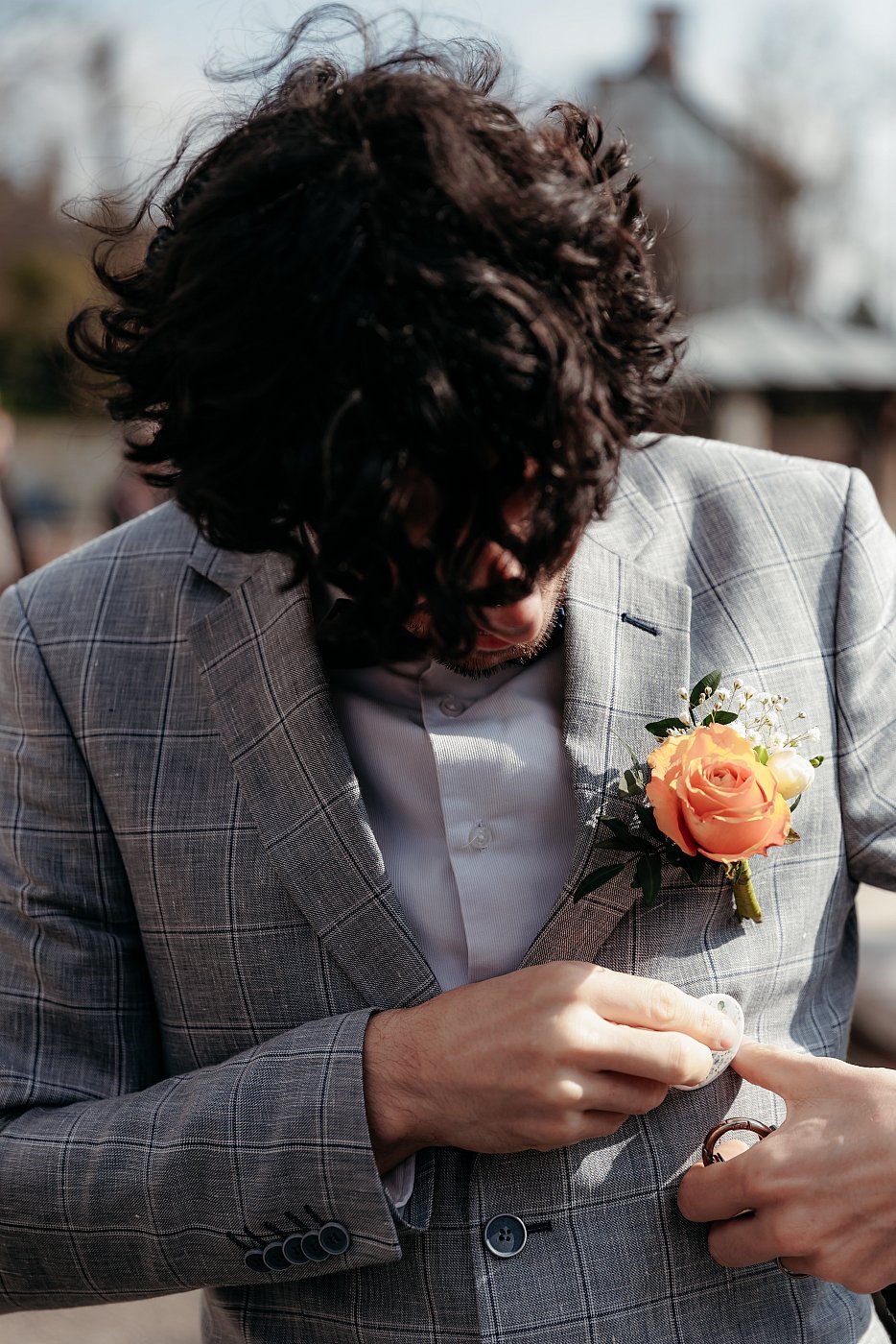 C'est aussi le moment choisi par les témoins pour accrocher les petites roses sur les poches de leur costume. Chacun aide l'autre à fixer correctement la fleur qui peut s'avérer parfois capricieuse à rester en place 😅.