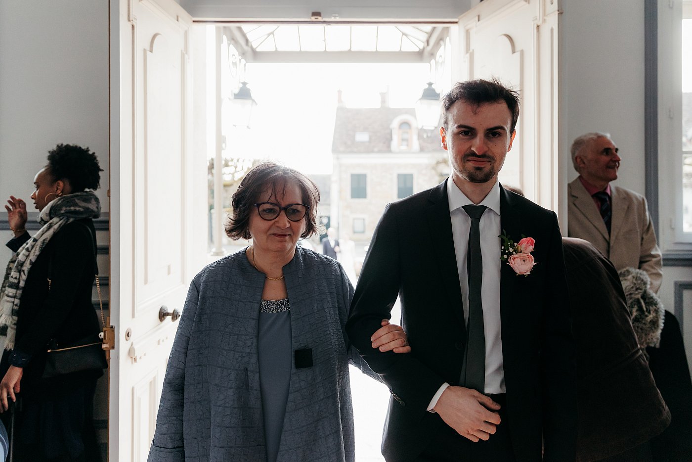 C'est le futur marié et sa mère qui rentrent les premiers. Pour ma part, je les précède de quelques pas en marchant à reculons pour ne rien louper de leur entrée.