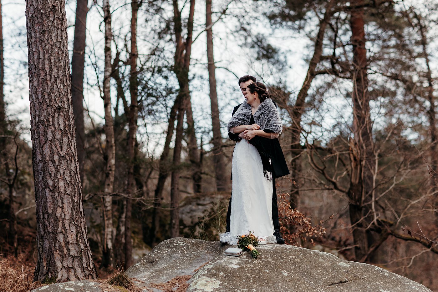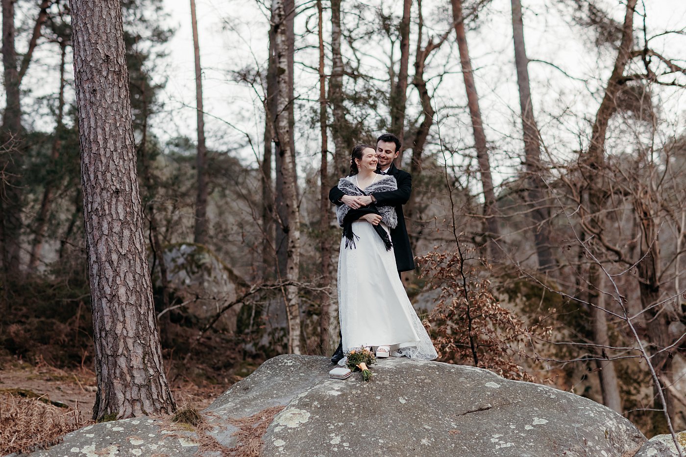 J'ai débuté les photos au pied de la grosse pierre, en contre-plongée, ce qui m'a permis de pouvoir photographier les amoureux avec les branches d'arbre en arrière-plan...