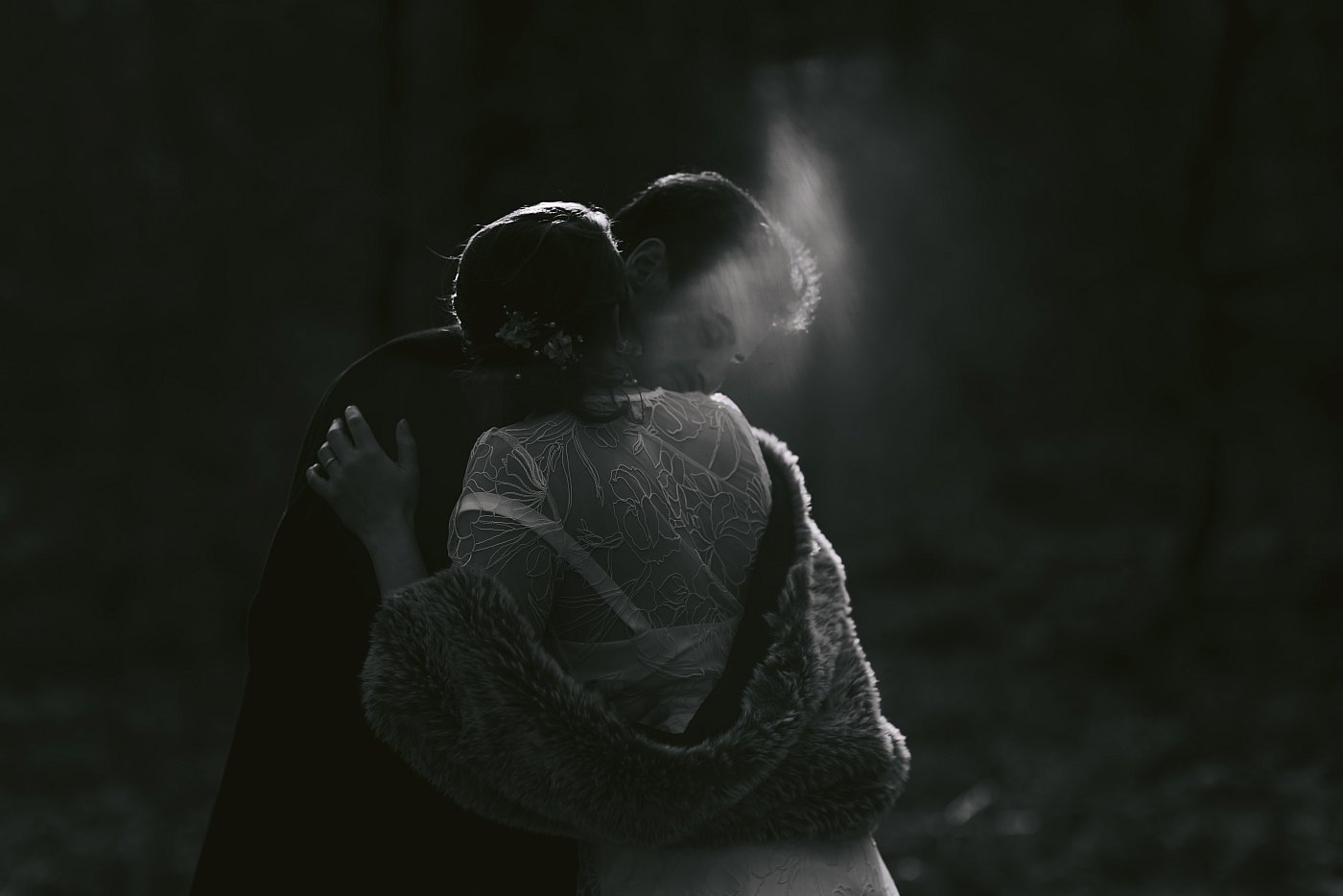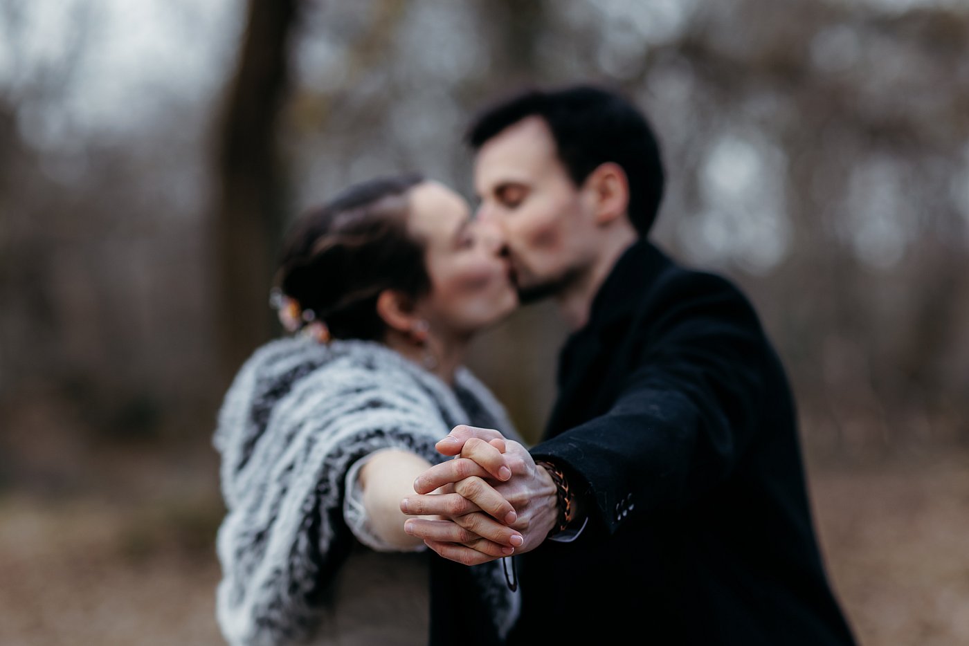 L’idée est simple : faire la mise au point sur leurs doigts entrelacés, pendant qu’en arrière-plan, légèrement flous, ils s’embrassent. Cela nous donne un résultat velouté et cotonneux, traduisant parfaitement ce moment de tendresse partagée.