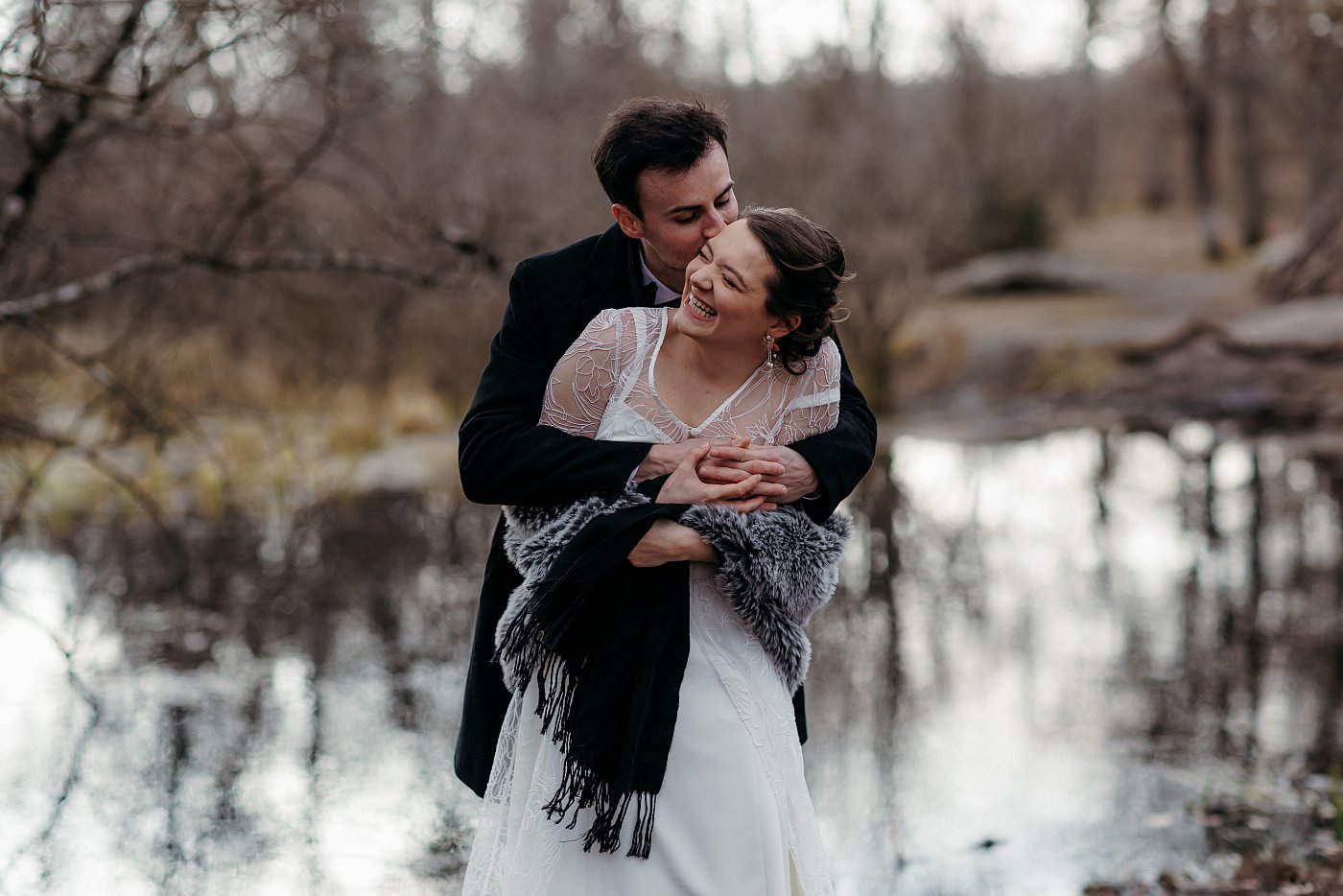 Je demande à nos tourtereaux de se placer au bord du petit plan d'eau et de jouer au "jeu des bisous". Le marié se place derrière la mariée et commence à lui faire des petits bisous dans le cou le plus vite possible.
