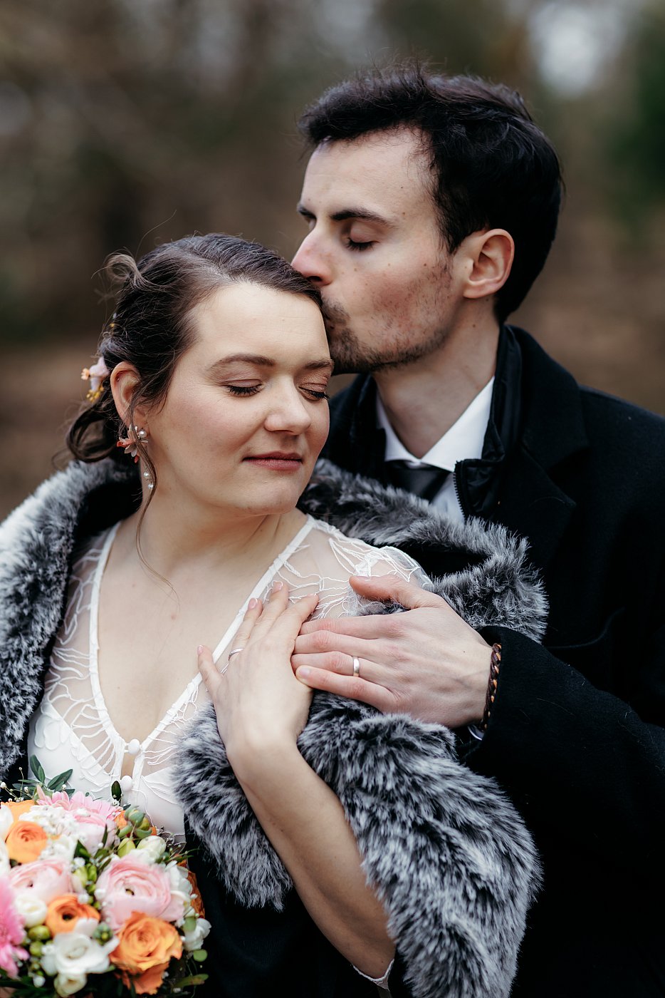 J'ai ensuite demandé au marié de nous rejoindre et j'ai demandé au couple de poser chacun leur main portant l'alliance sur l'épaule de la mariée. L'idée, ici, est de les faire passer un petit moment de tendresse ensemble tandis qu'ils ferment les yeux.