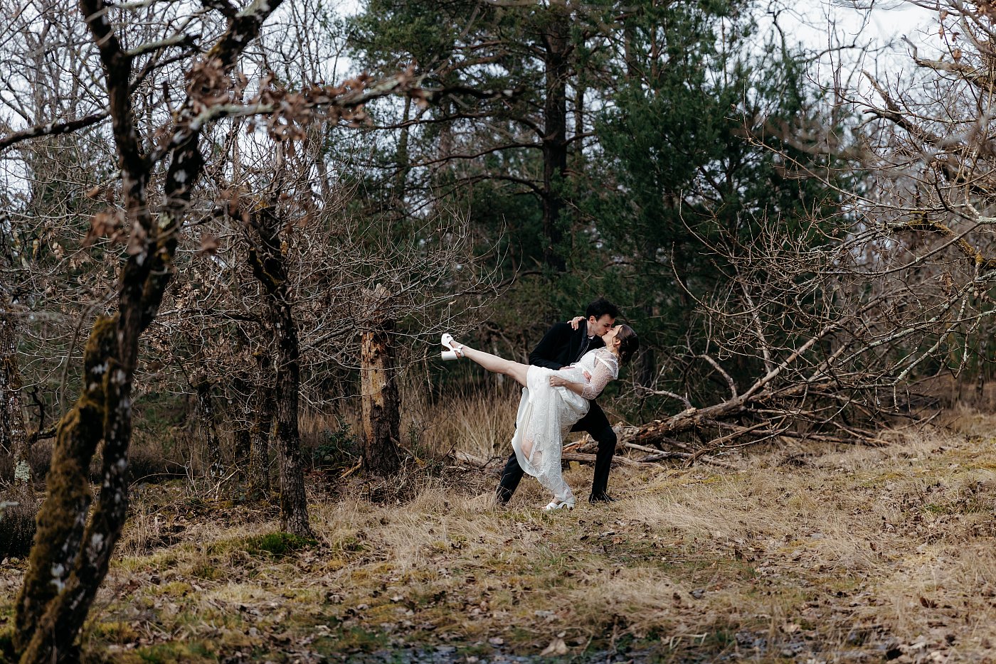 Pour la suite, j'ai choisi d'exploiter une petite clairière pour demander aux mariés de réaliser la pose du fameux "wedding dip". Et pour ceux qui ne connaissent pas le wedding dip, voici une description formelle :