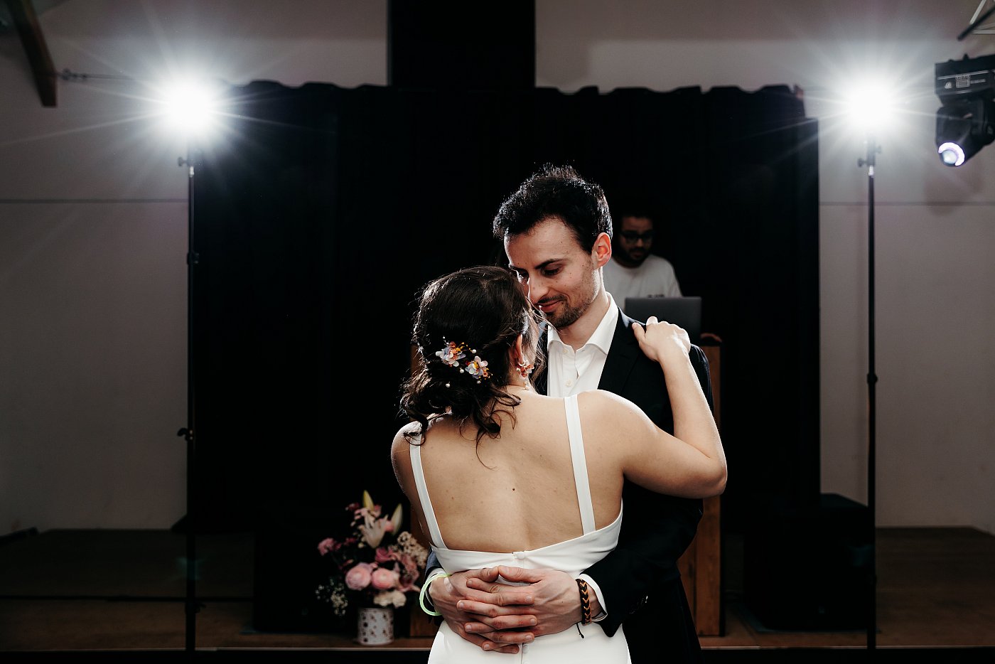 Le Maire se trouvait au fond de la salle, face au couple en train d’échanger les anneaux. La lumière extérieure, directement projetée sur eux, offrait un rendu peu contrasté (contrairement au contre-jour).
