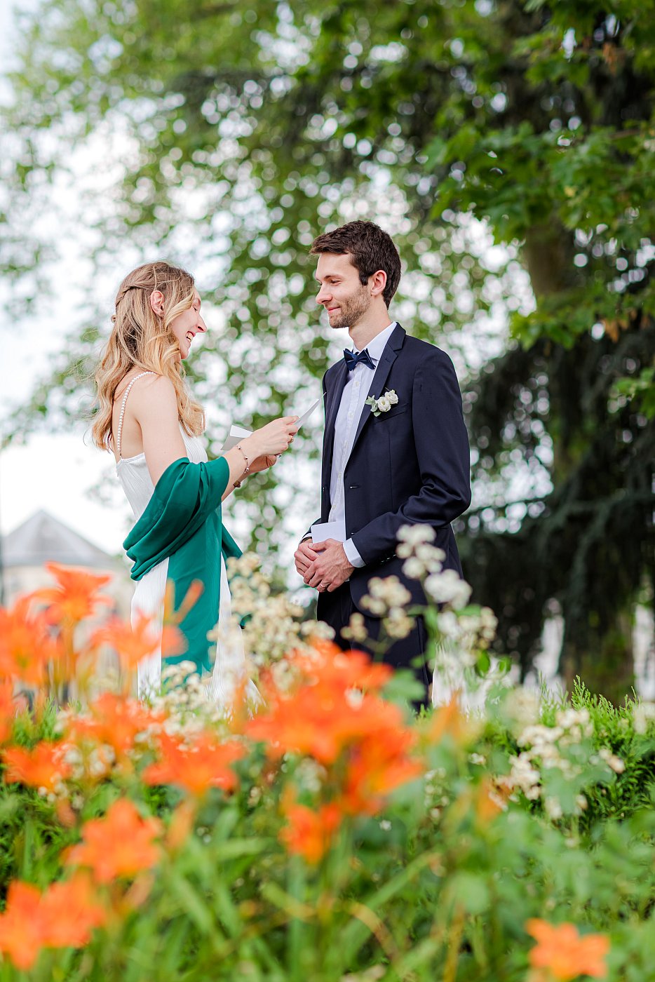 Après avoir réalisé quelques photos dans ce bel endroit des Yvelines, la mariée s'est approchée de moi pour me demander si je pouvais les photographier pendant qu'ils se lisaient mutuellement une lettre de voeux écrite spécialement pour ce grand moment.