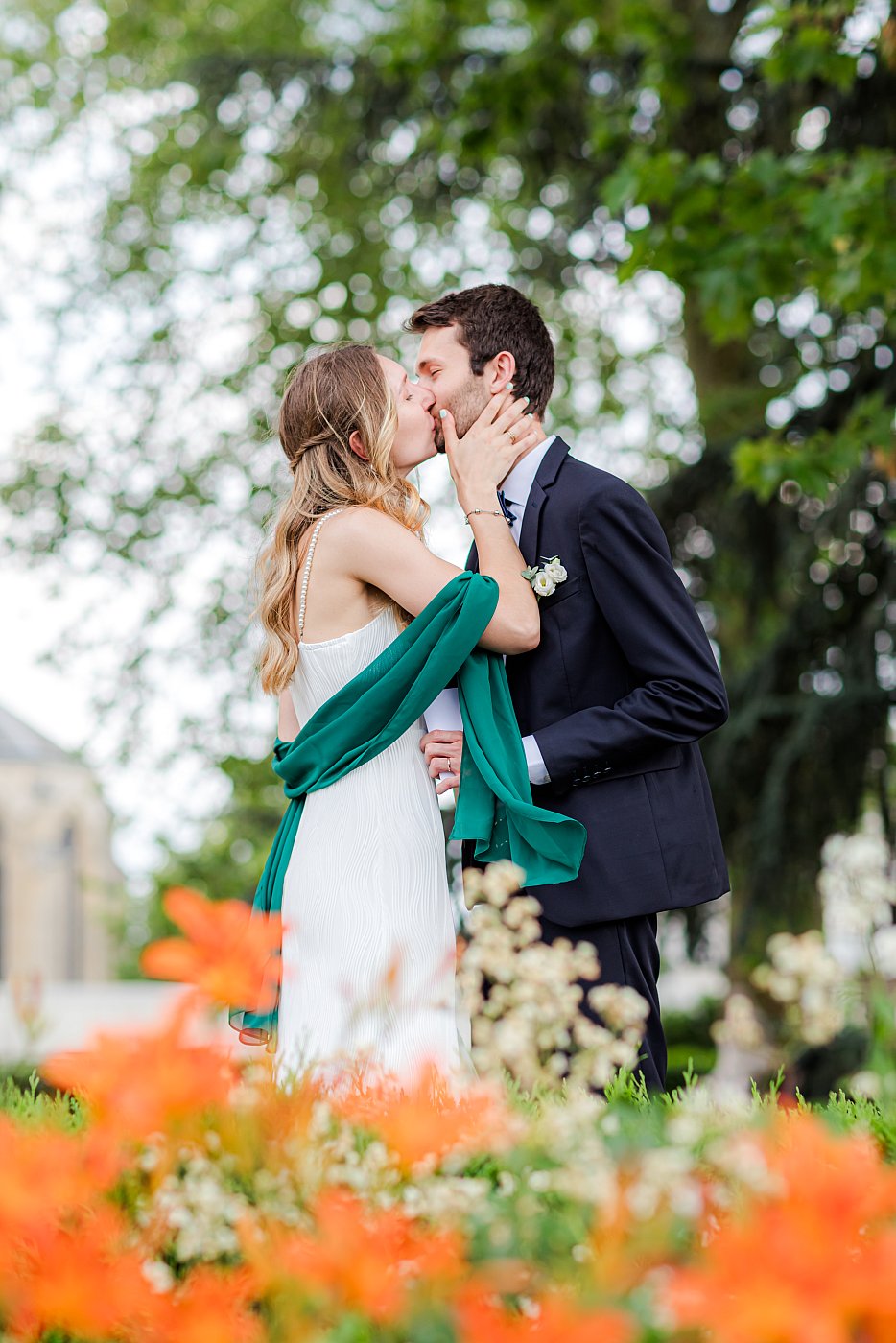 J'avais donc, un premier plan magnifiquement fleuri, un arrière plan constitué des feuilles d'un arbres et mes mariés qui partagèrent l'un des plus beaux moments que j'ai eu l'occasion de vivre lors d'un mariage.