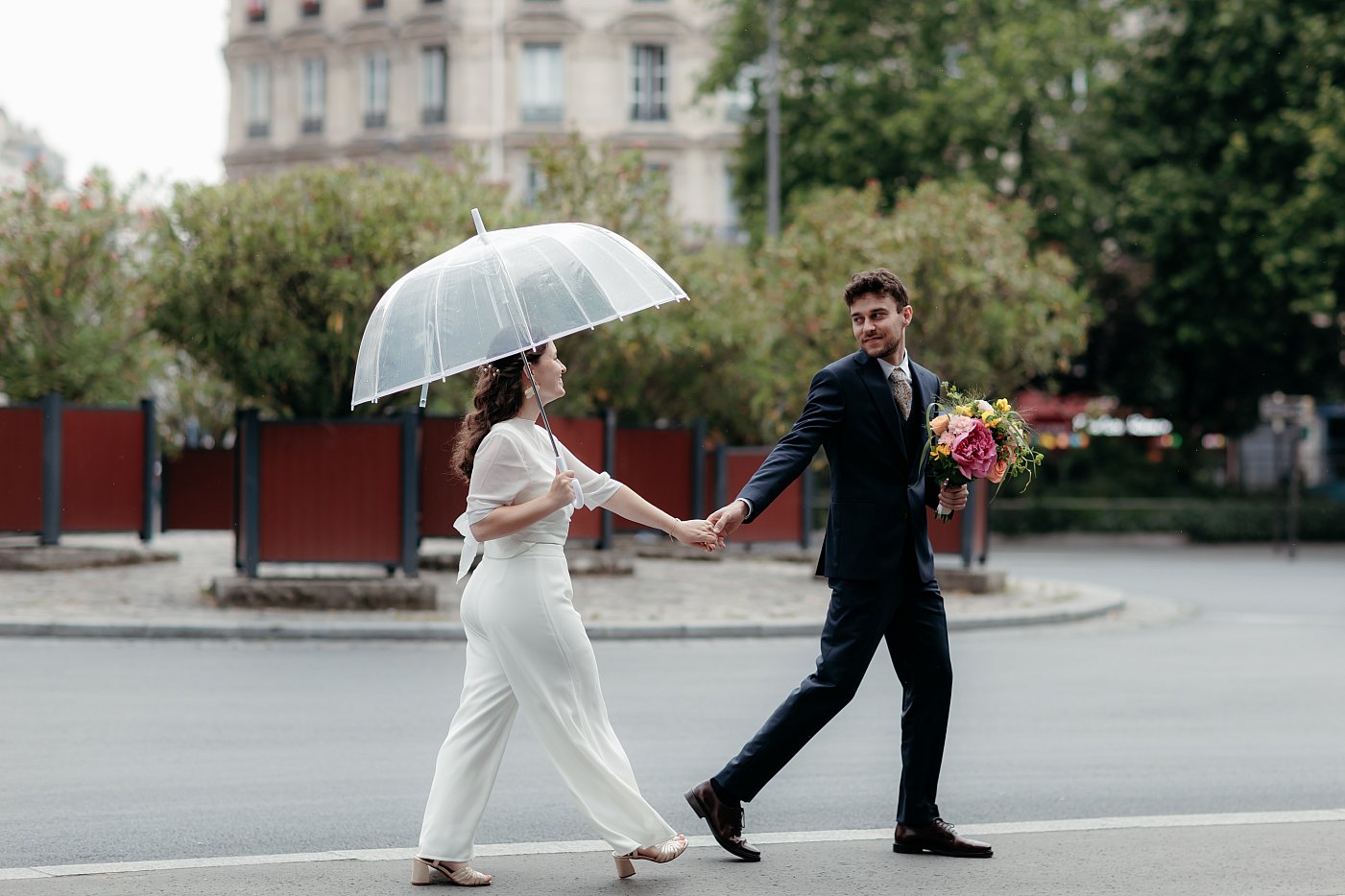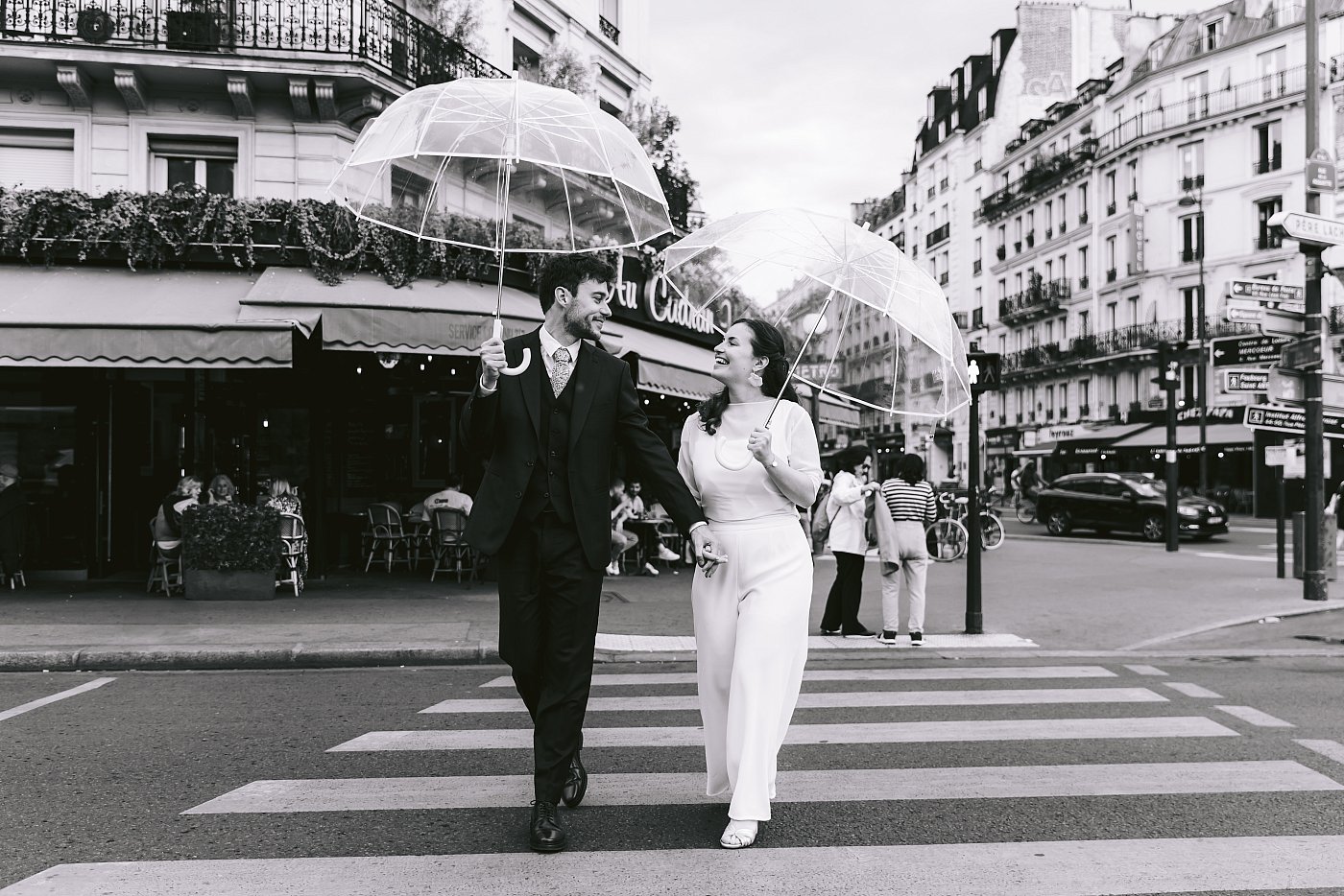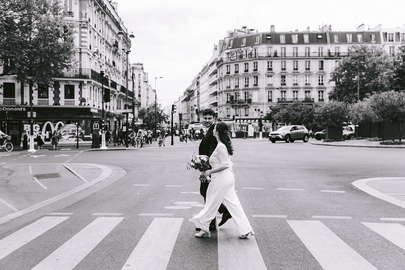 Nous débutons par une scène pour le moins classique : les mariés traversant un passage piéton, en marchant main dans la main, dans les rues de Paris aux abords de la place Léon Blum.