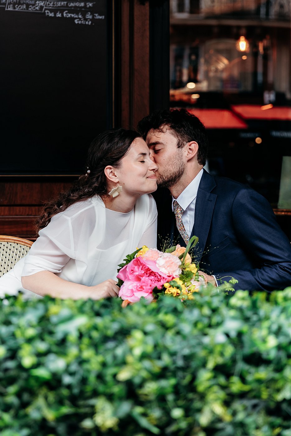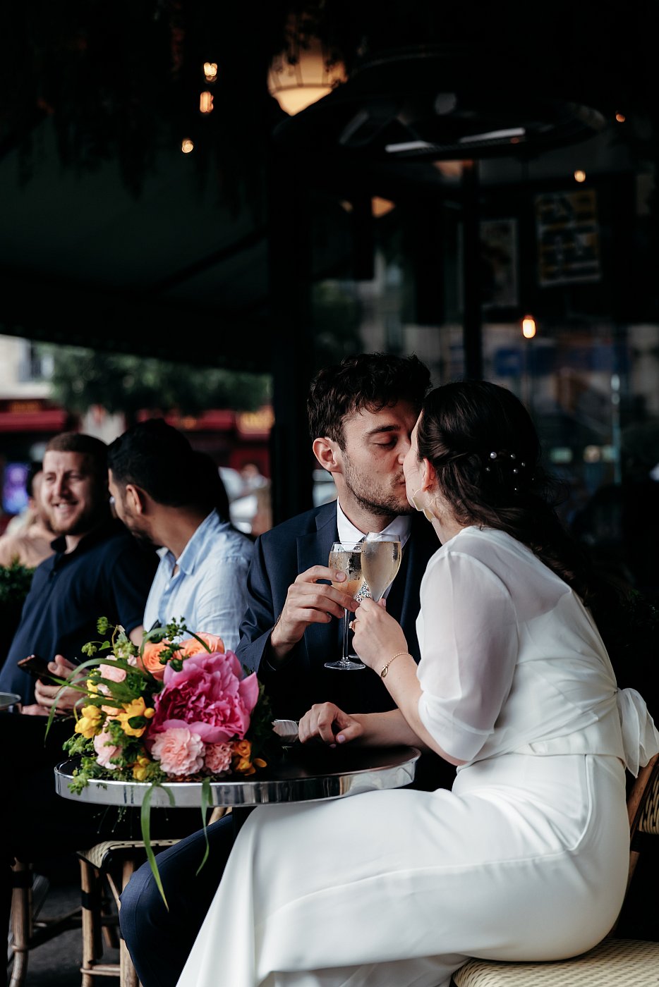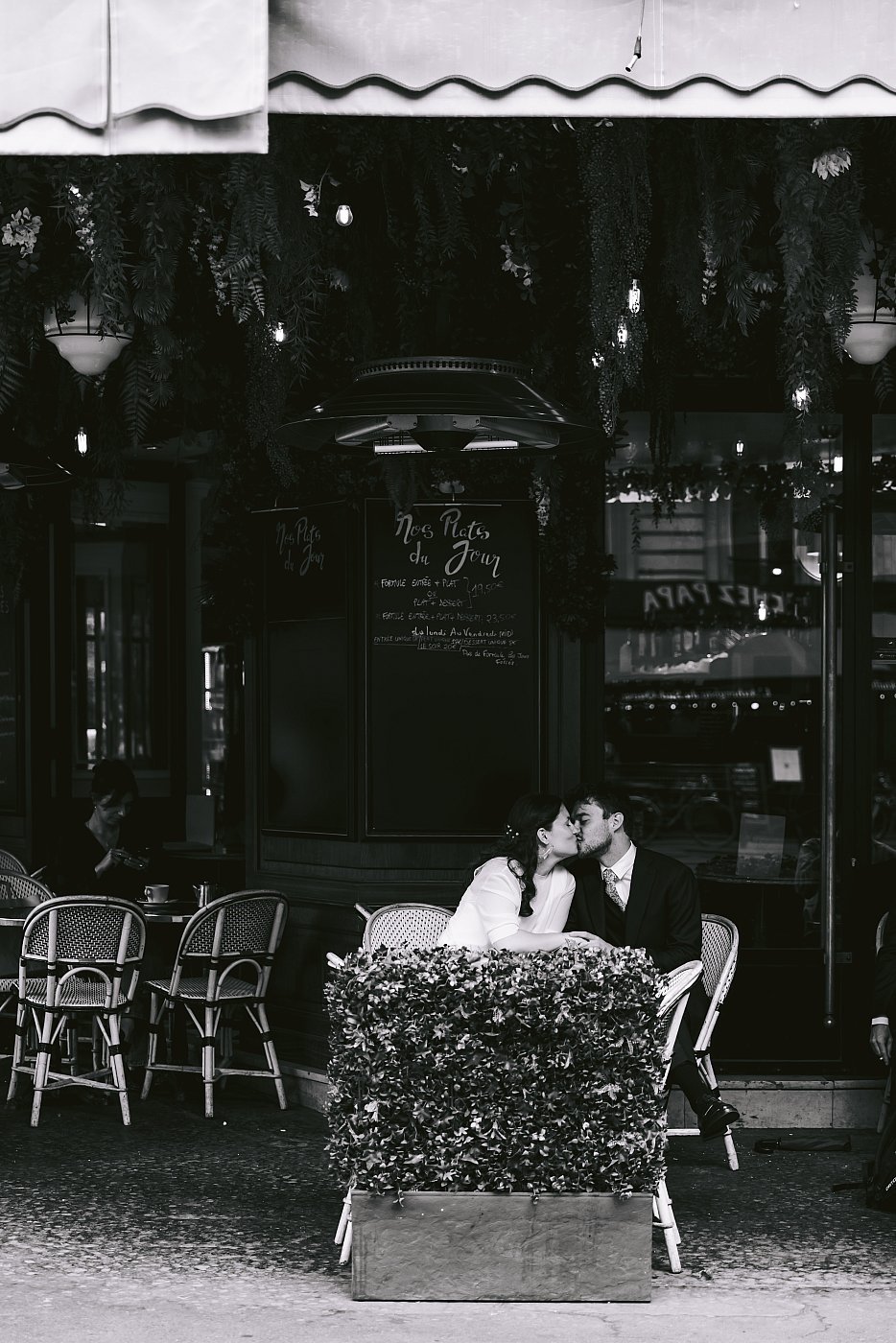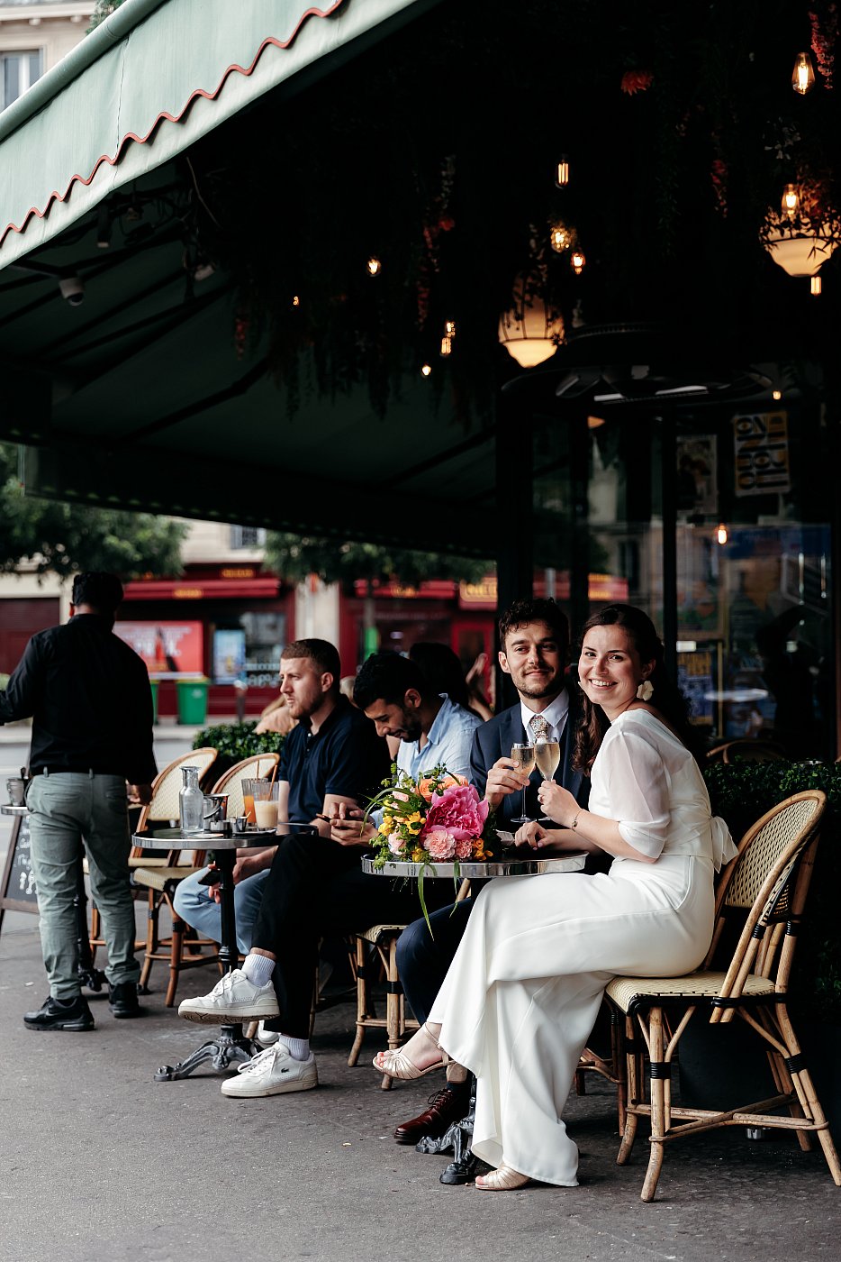 Les tourtereaux prennent place en terrasse tandis que je varie les plans et cadrages, afin d’immortaliser leur complicité et leur joie de manière harmonieuse.
