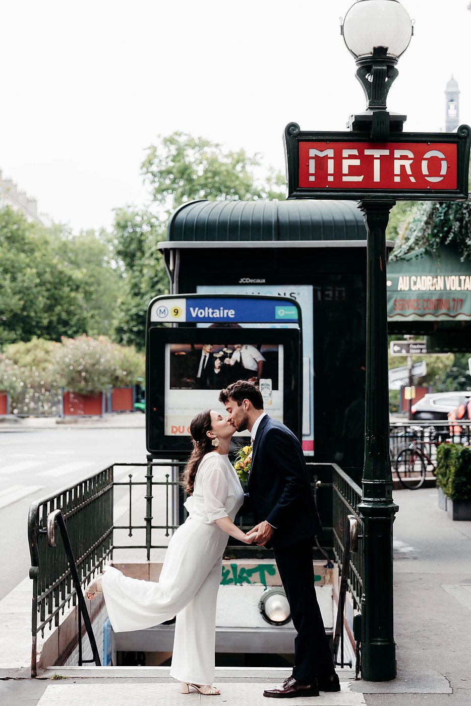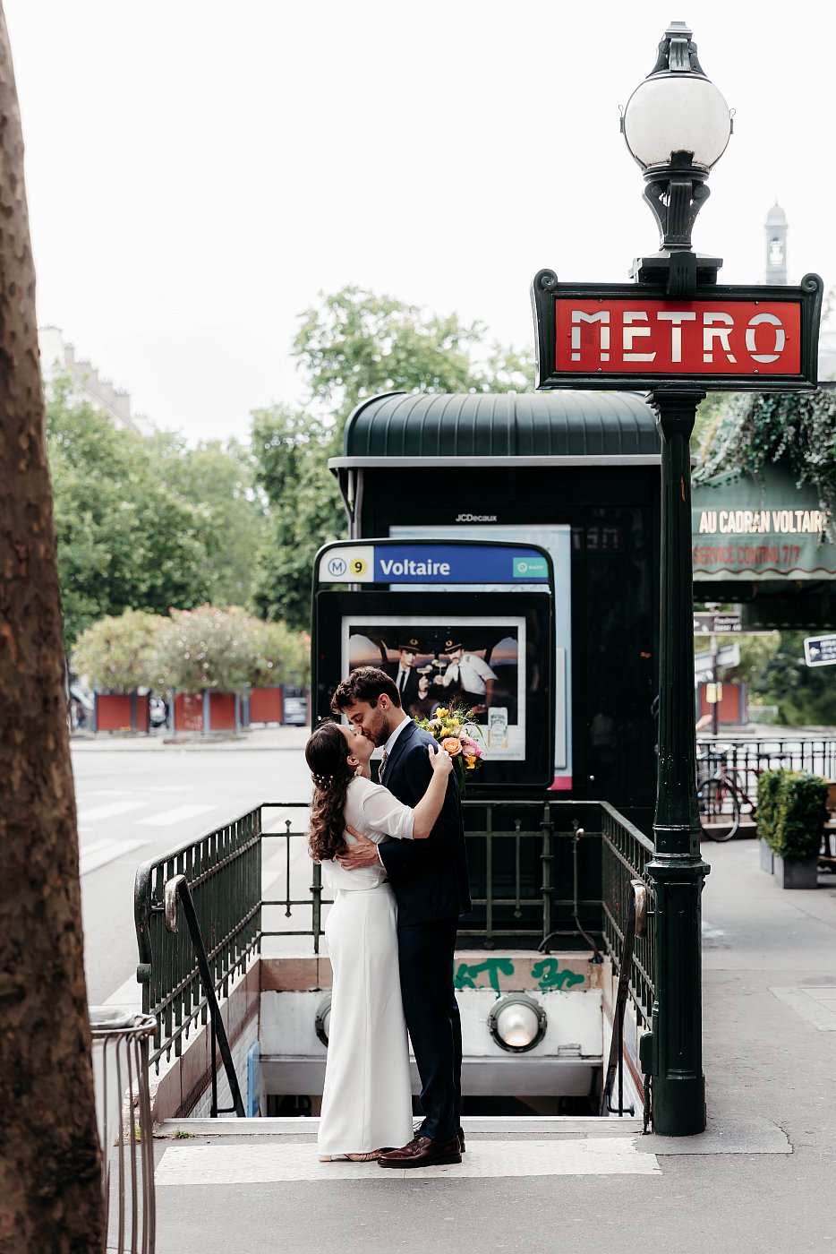 Après la terrasse de la brasserie, nous poursuivons cette séance photo de couple aux abords de l'entrée du métro qui se trouve juste en face. Il s'agit de la station Voltaire, qui nous offre, encore une fois, un décor typiquement parisien : les escaliers entourés de grilles en fer forgé et la fameuse inscription « métro » blanche sur fond rouge.