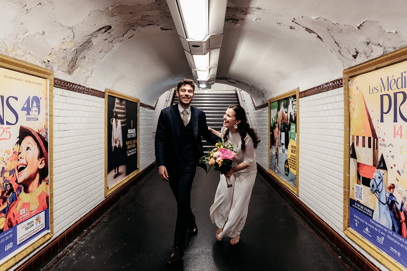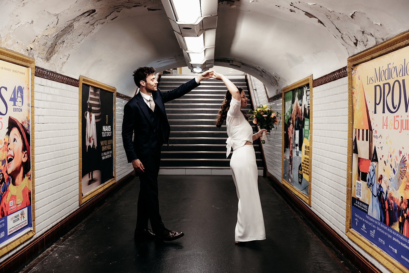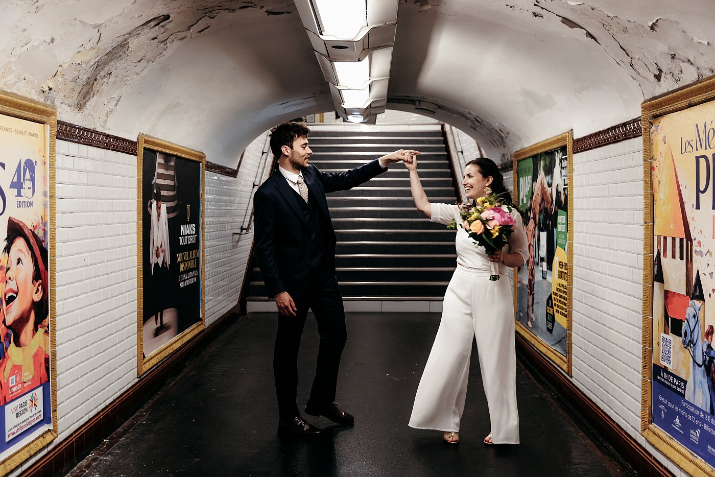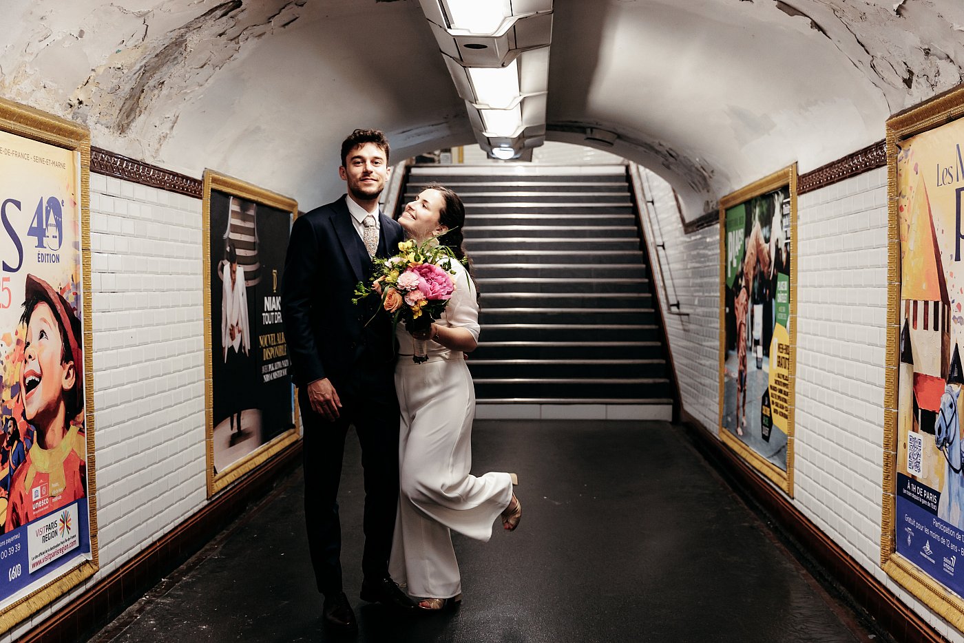Qui dit « métro parisien » dit également ces longs couloirs et escaliers interminables qui nous emmènent au quai. Ici aussi, ce décor sera prétexte à réaliser de nombreuses photos de couple.