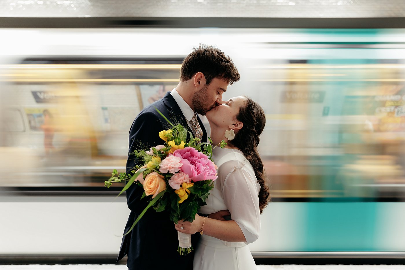 Tout d’abord, les mariés s’échangeant un long baiser tandis que la rame de métro passe devant eux.