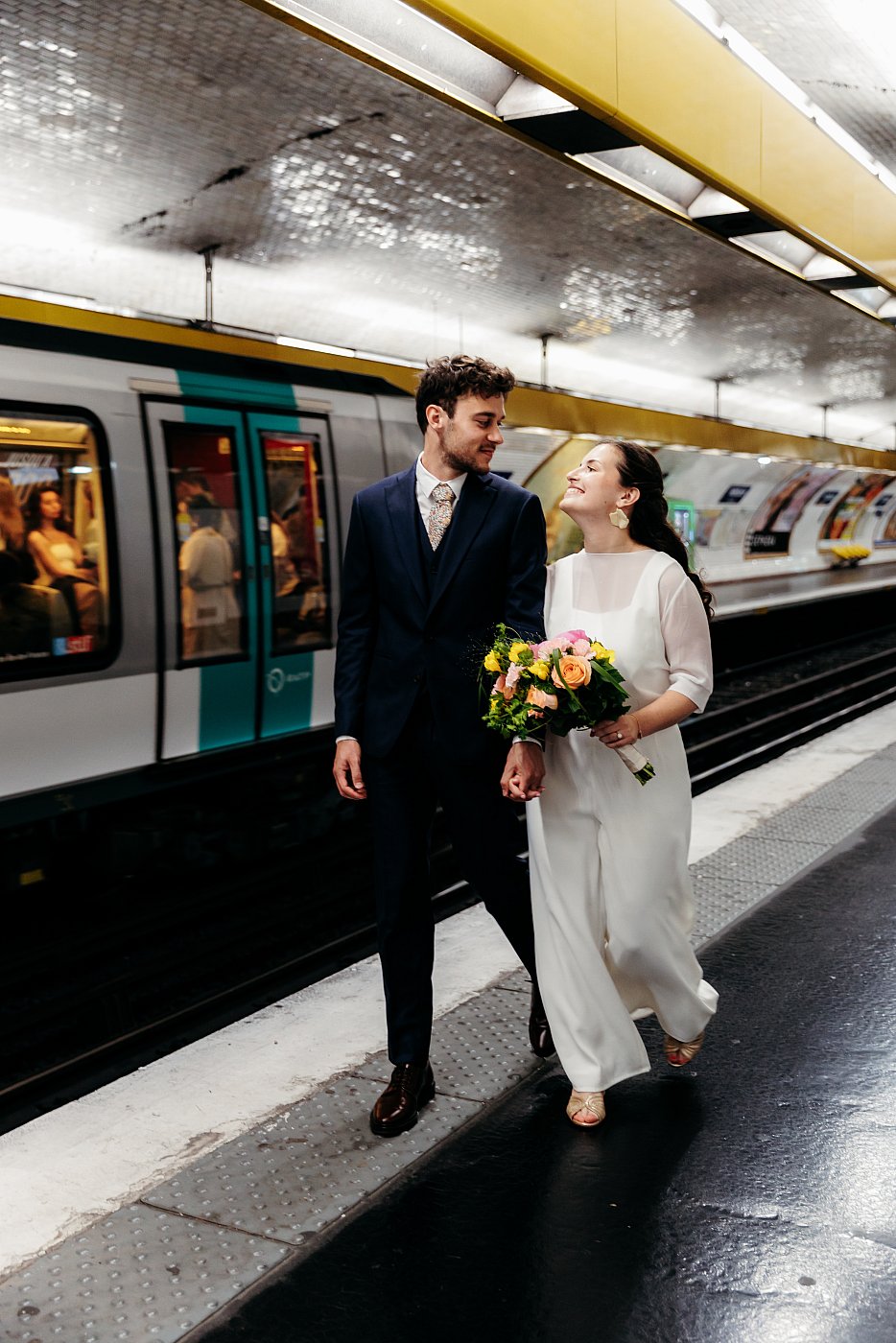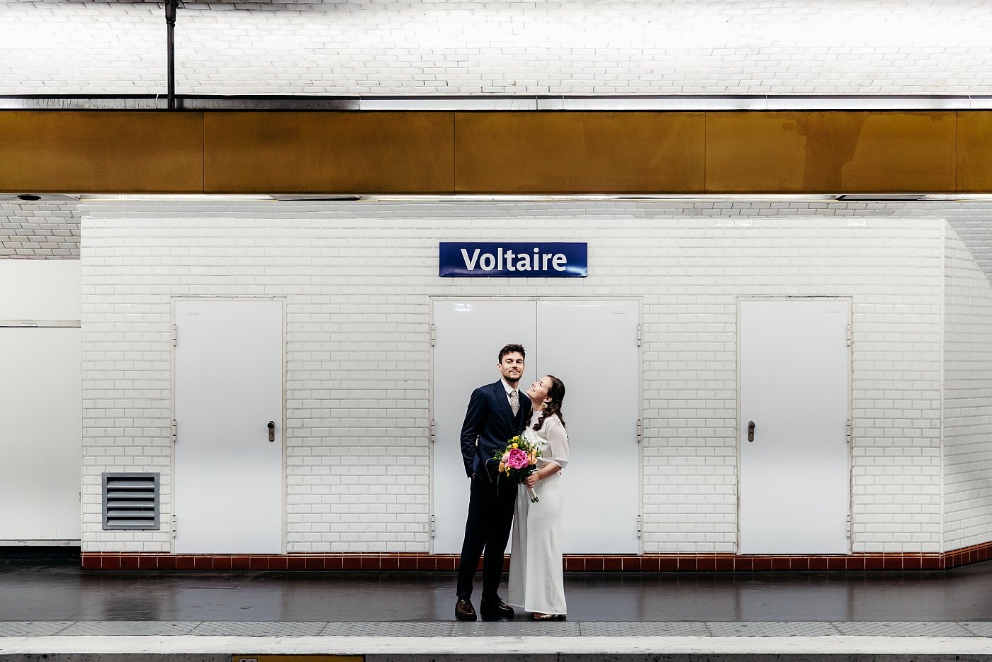 Je demande aux mariés de marcher de manière enjouée le long du quai, tandis que je me positionne de biais pour profiter des belles lignes de fuite offertes par la station de métro.