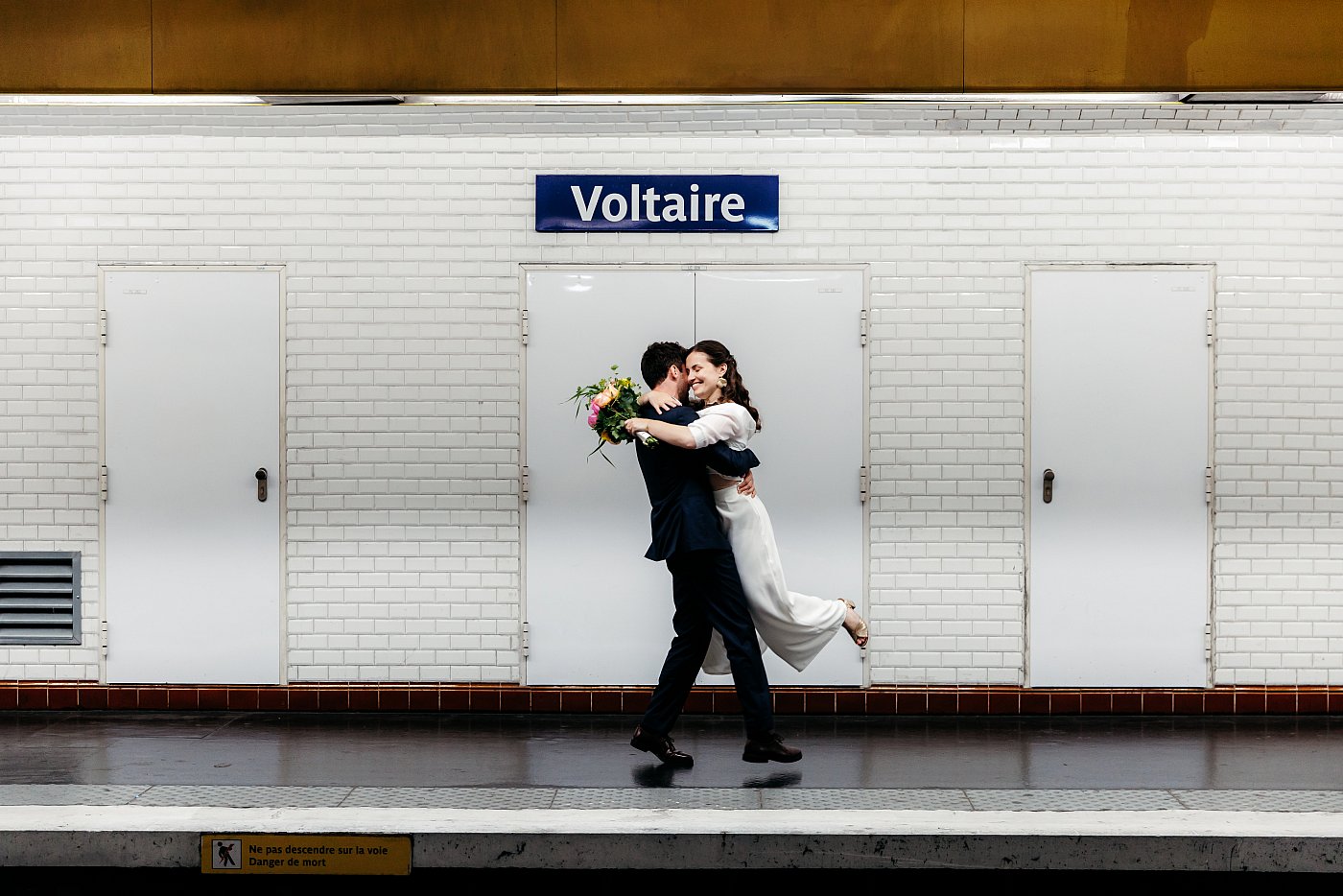 Jouer avec ces points de fuite lors de la petite marche des mariés fait germer, dans mon esprit, ma prochaine idée de composition. Alors qu’une nouvelle rame se prépare à entrer dans la station, je demande aux mariés d’échanger un baiser en bordure du quai.