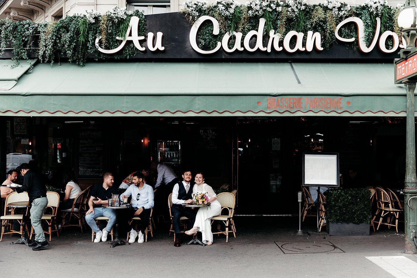La traversée du passage piéton nous amène directement à la terrasse d’une brasserie typiquement parisienne portant le nom du "Cadran Voltaire". Un nouveau décor de choix pour des photos de couple dans une ambiance résolument parisienne 🇫🇷.