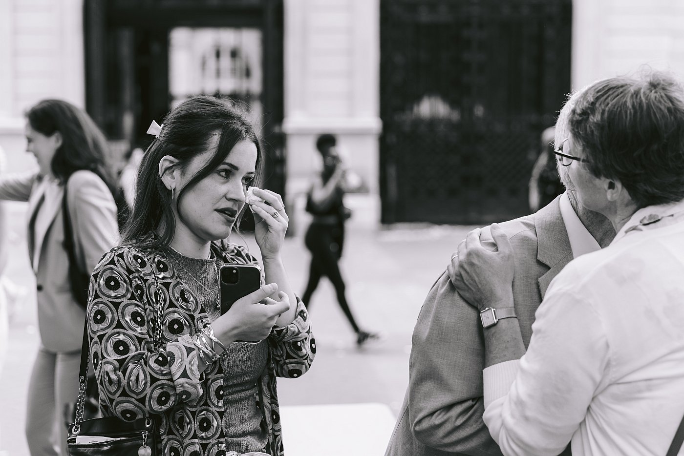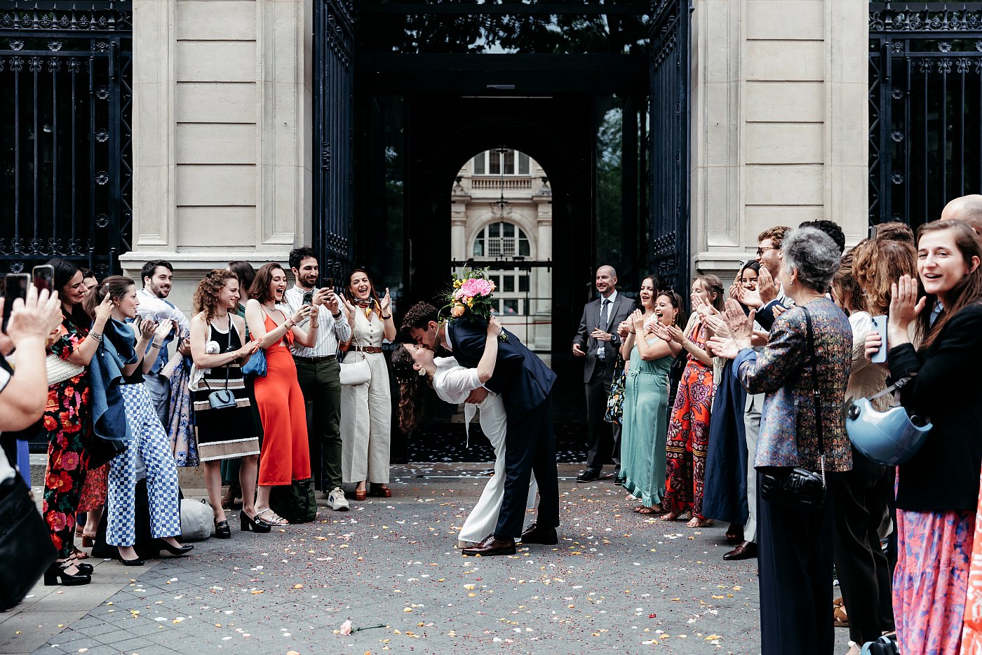 Les invités sont disposés en haie d'honneur, de part et d'autre des portes de la mairie, les réglages de mon appareil photo ont l'air corrects 📷.