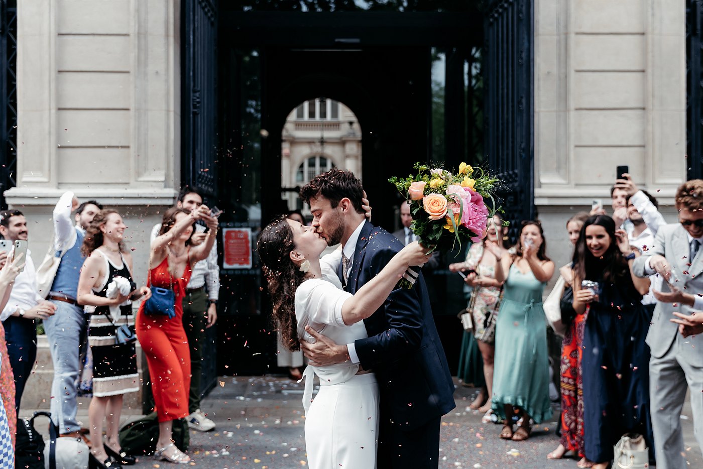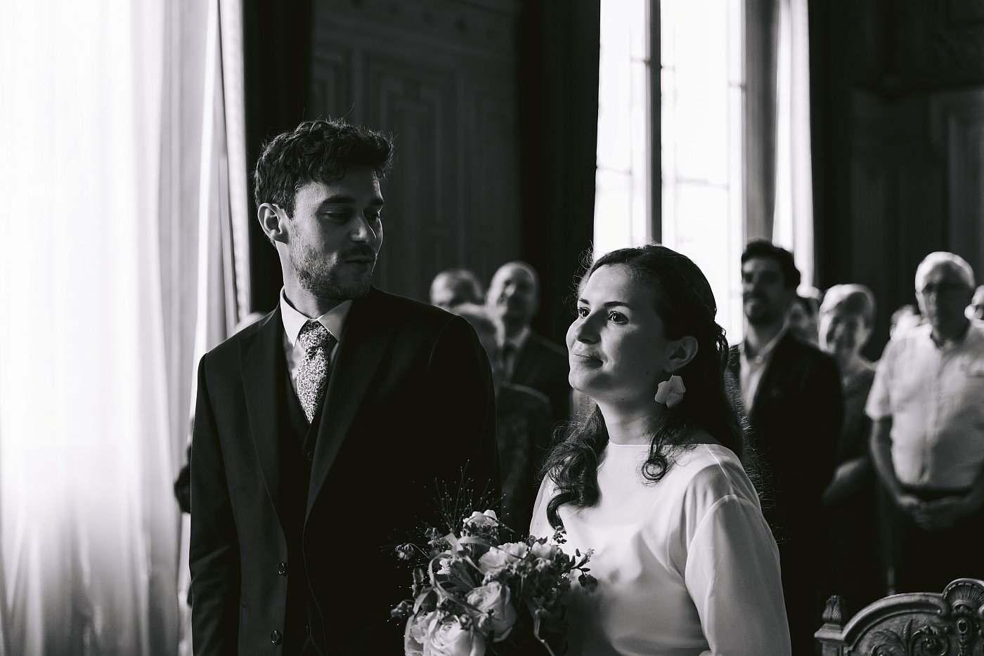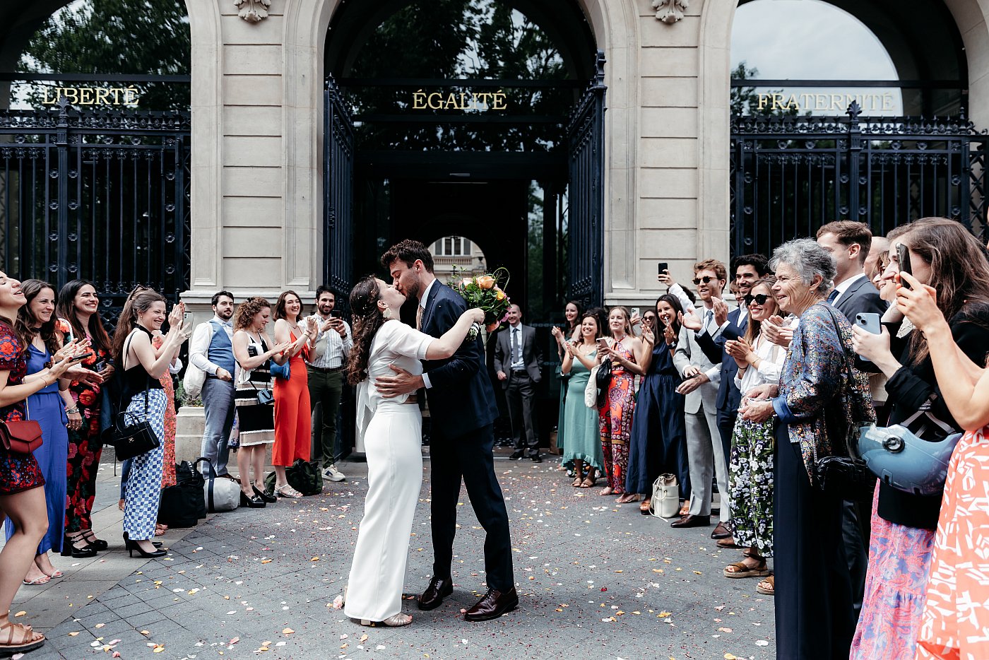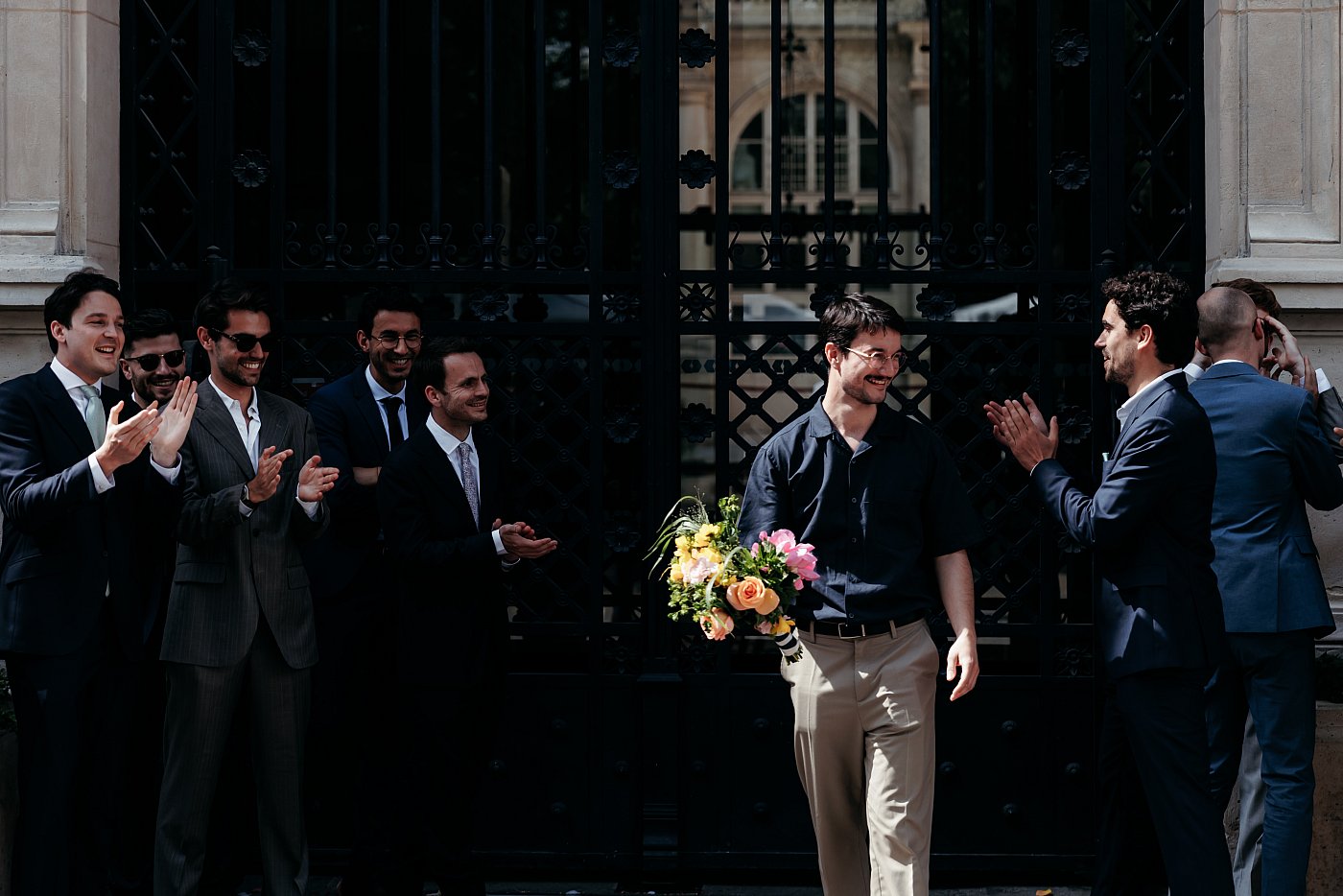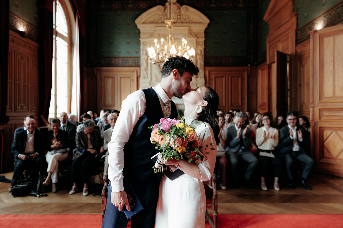 Petite entorse à la tradition (qui veut que le marié entre au bras de sa mère et que la mariée entre au bras de son père), ici les amoureux seront, chacun, accompagnés de leurs deux parents pour entrer dans la belle salle des mariages de la mairie du 11ᵉ arrondissement de Paris.