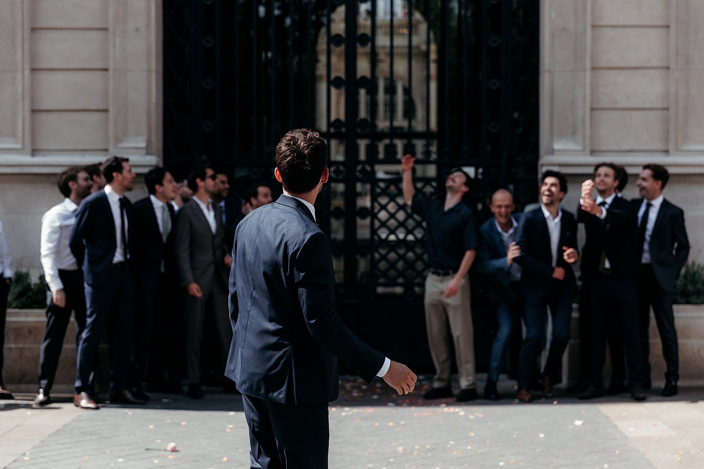 Avant de débuter la sortie, je demande aux mariés d'attendre mon signal. Il faut, en effet, que je revoie les réglages de mon appareil photo afin de les adapter à la lumière du jour et que je m'assure que les invités soient bien disposés de part et d'autre des portes de la mairie.