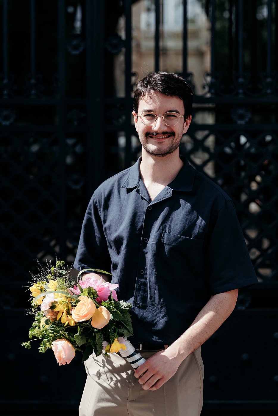 C’est aux environs de 14h30 que je retrouve « C & J », en jolie tenue de mariés, sur le parvis de la mairie. Sans tarder, nous débutons la séance photo de couple, car il s’agit de ne pas être en retard pour la cérémonie civile prévue à 15h30 ⏰