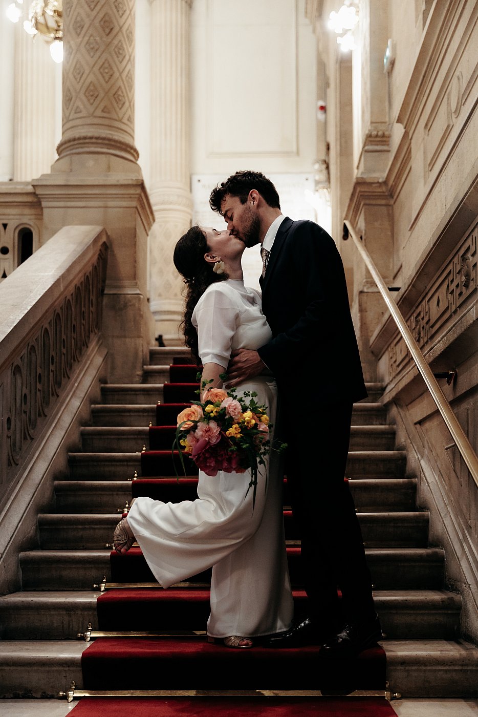 Ils se prêtent volontiers au jeu lors de la montée des marches et s'amusent à prendre la pose, à s'embrasser et à multiplier les interactions complices... Un régal pour un photographe de mariage 🤗.