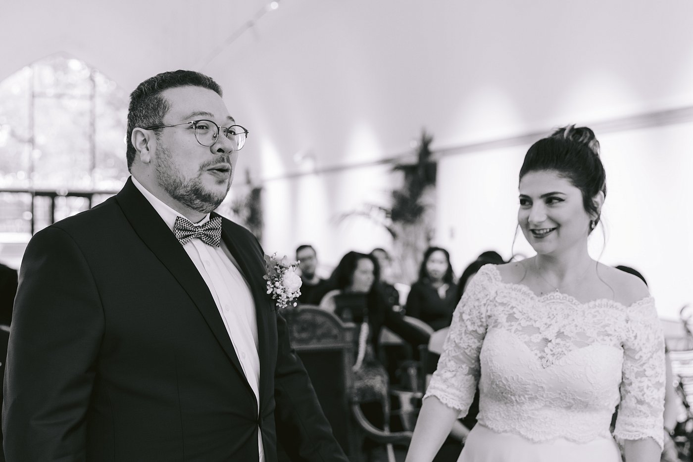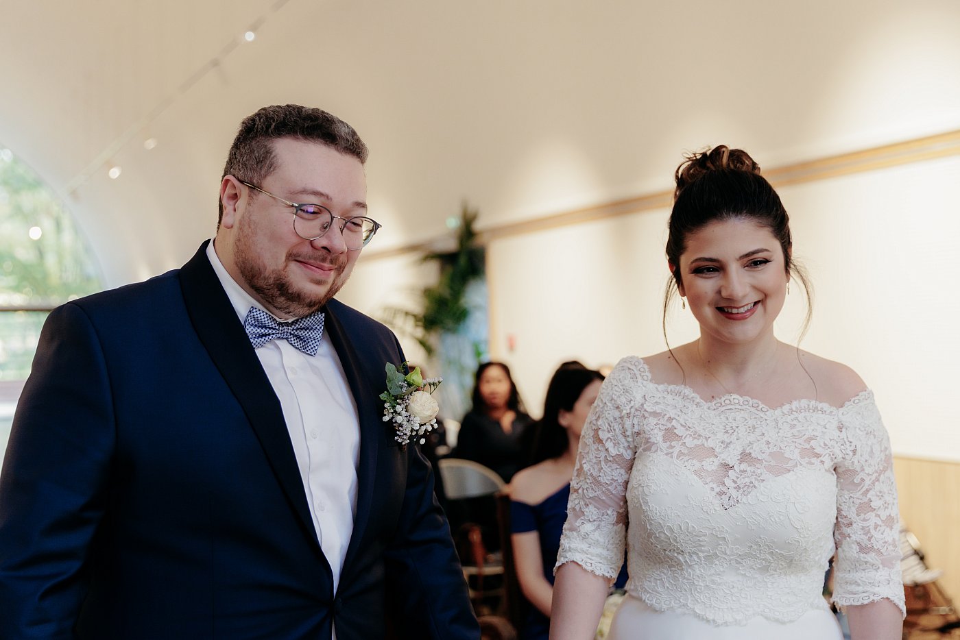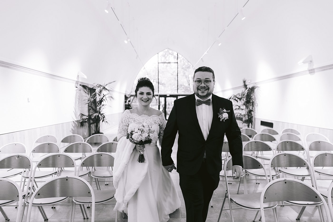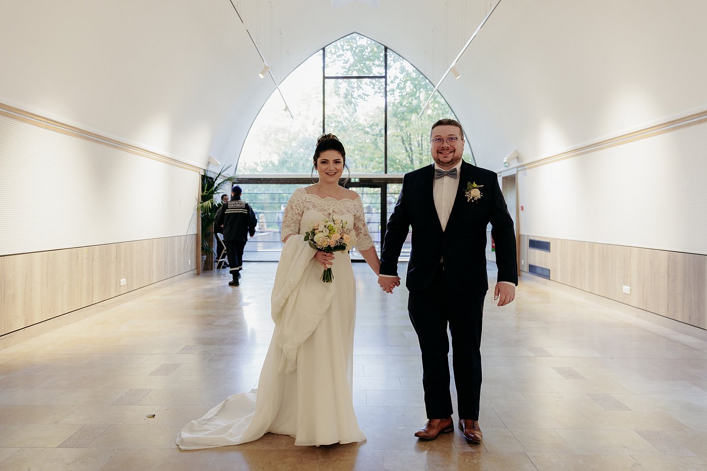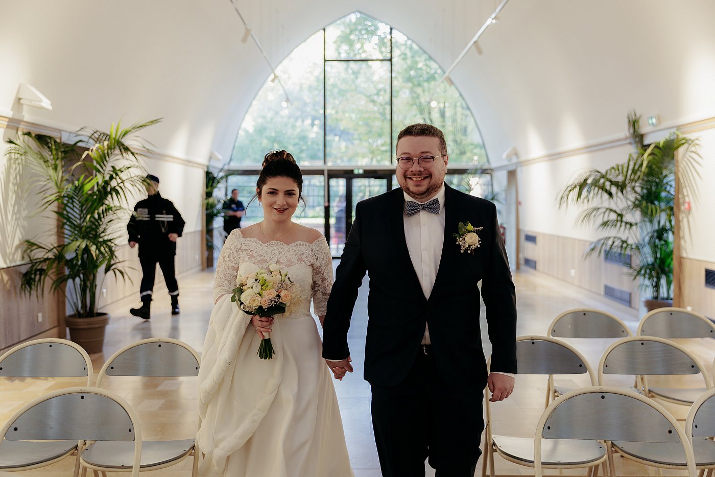 Je reste avec les mariés pour photographier leur entrée. Ils entrent par le fond de la salle des mariages en se tenant mutuellement la main.