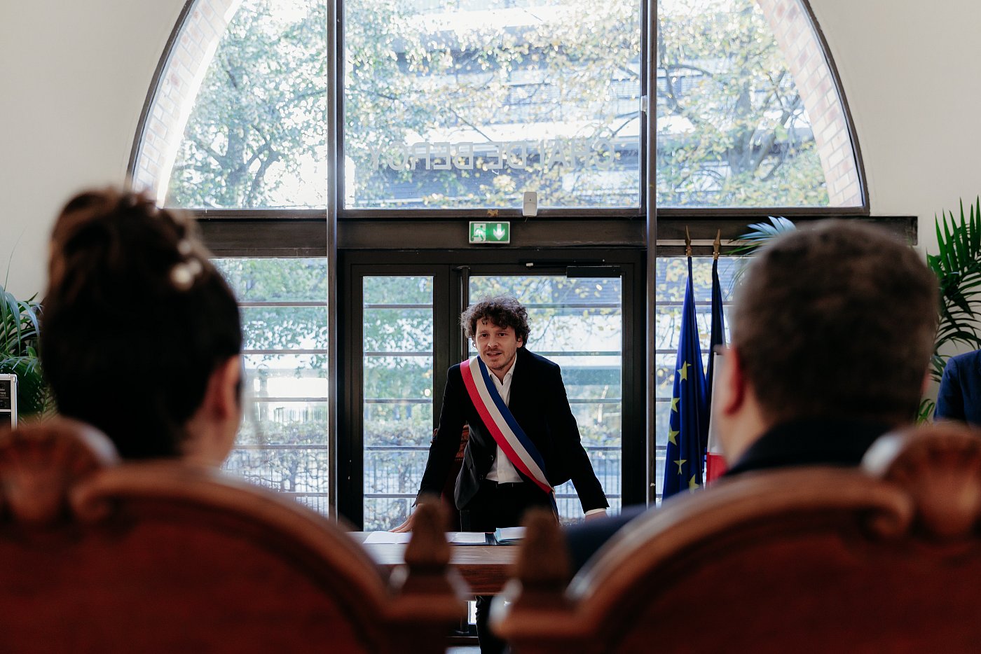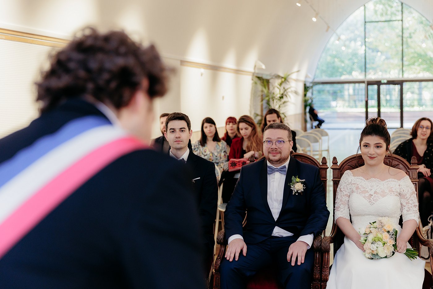 - Une vue avec les mariés vus de dos avec l'adjoint au maire entre eux.