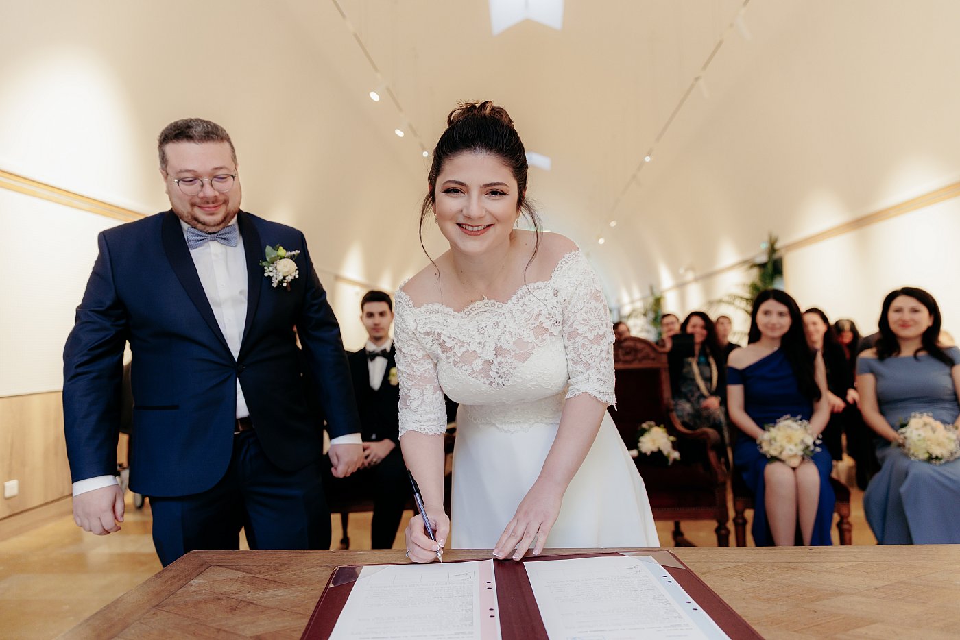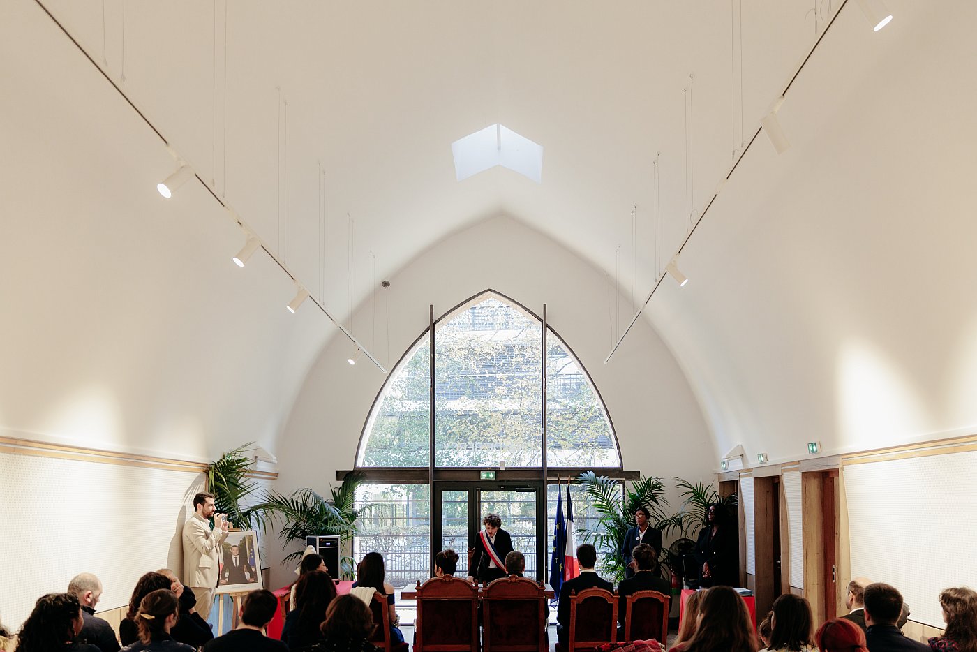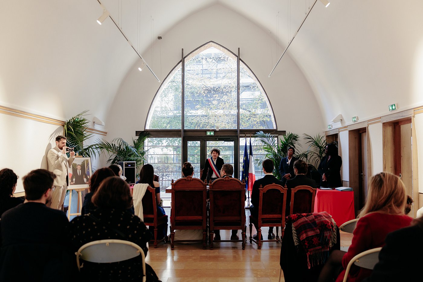 - Une vue arrière de la salle avec les invités, les mariés et l'équipe de la mairie.