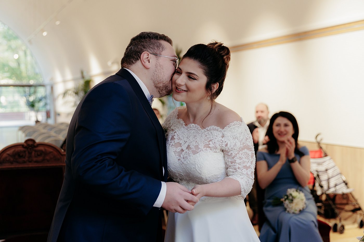 Vint ensuite le moment de la signature des registres et de l'échange des alliances. C'est d'abord la mariée qui a glissé l'anneau au doigt de son mari. Cet échange de bagues s'est conclu avec un petit baiser, sur la bouche cette fois, de circonstance 🥰.