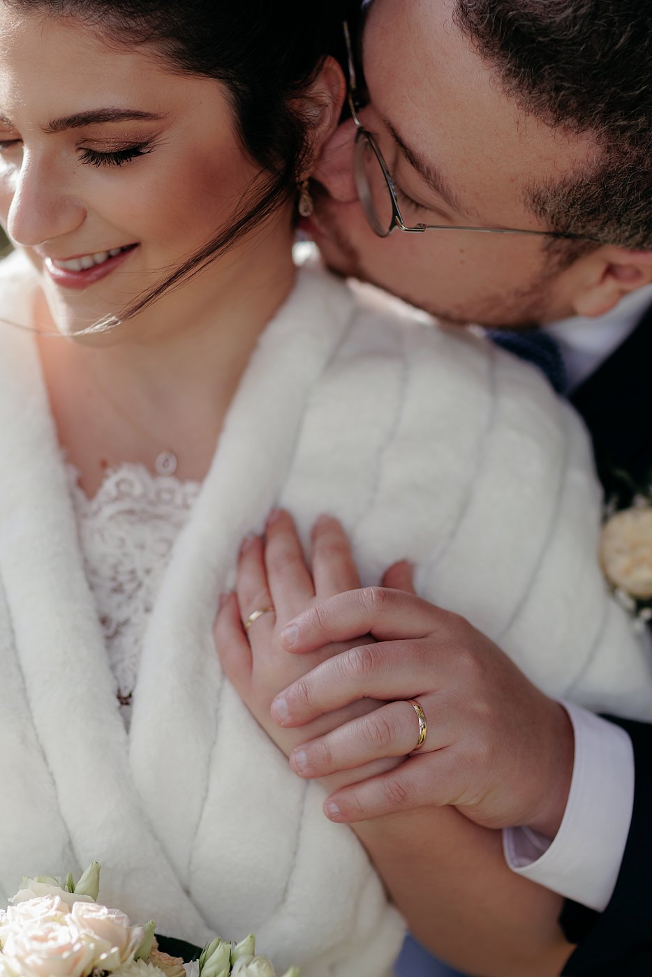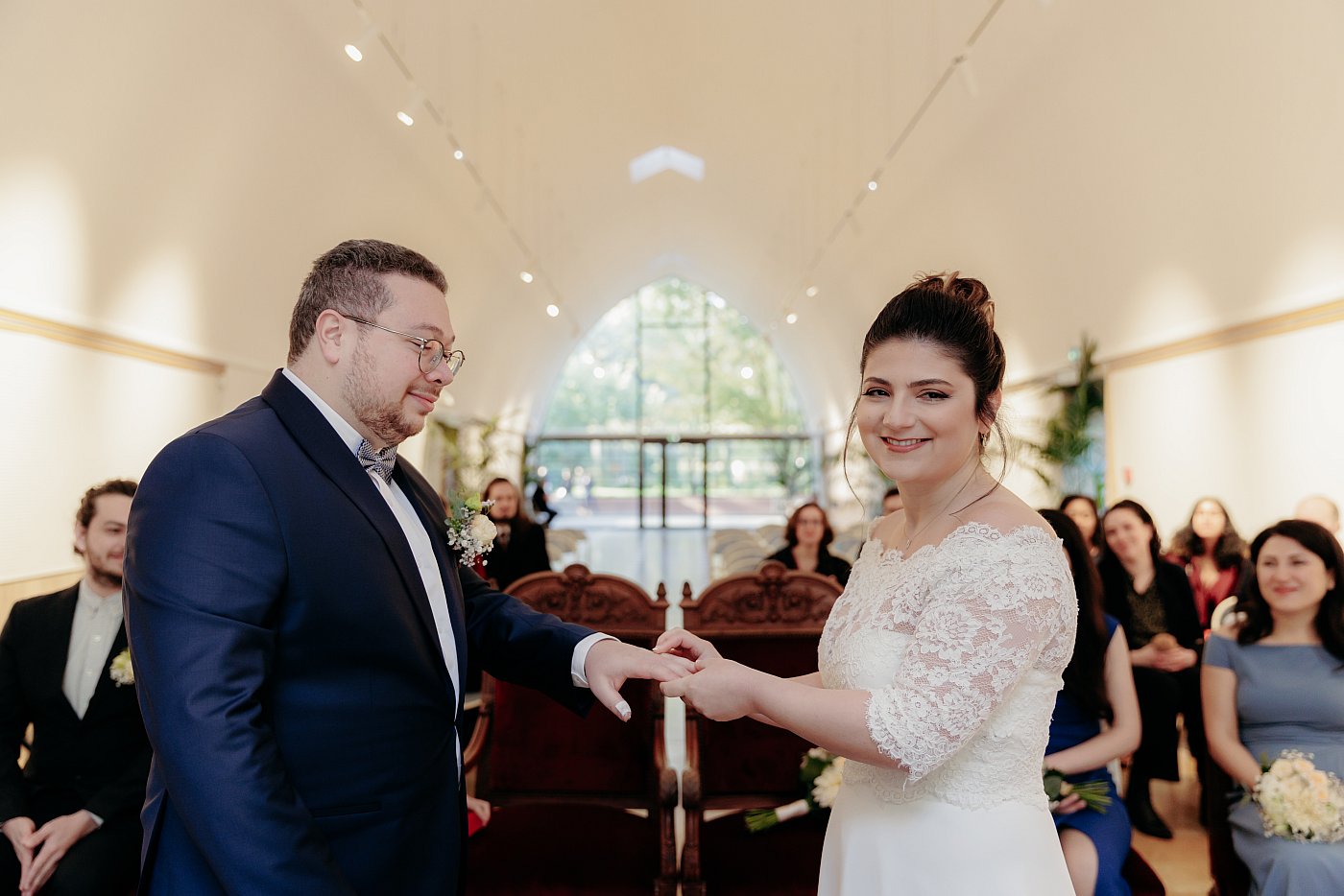 Le marié se place derrière elle, tout près, et vient glisser sa main (également celle qui porte l'anneau) à côté de la sienne.