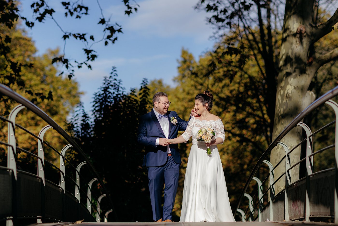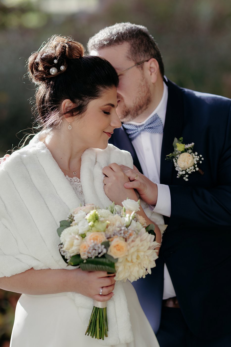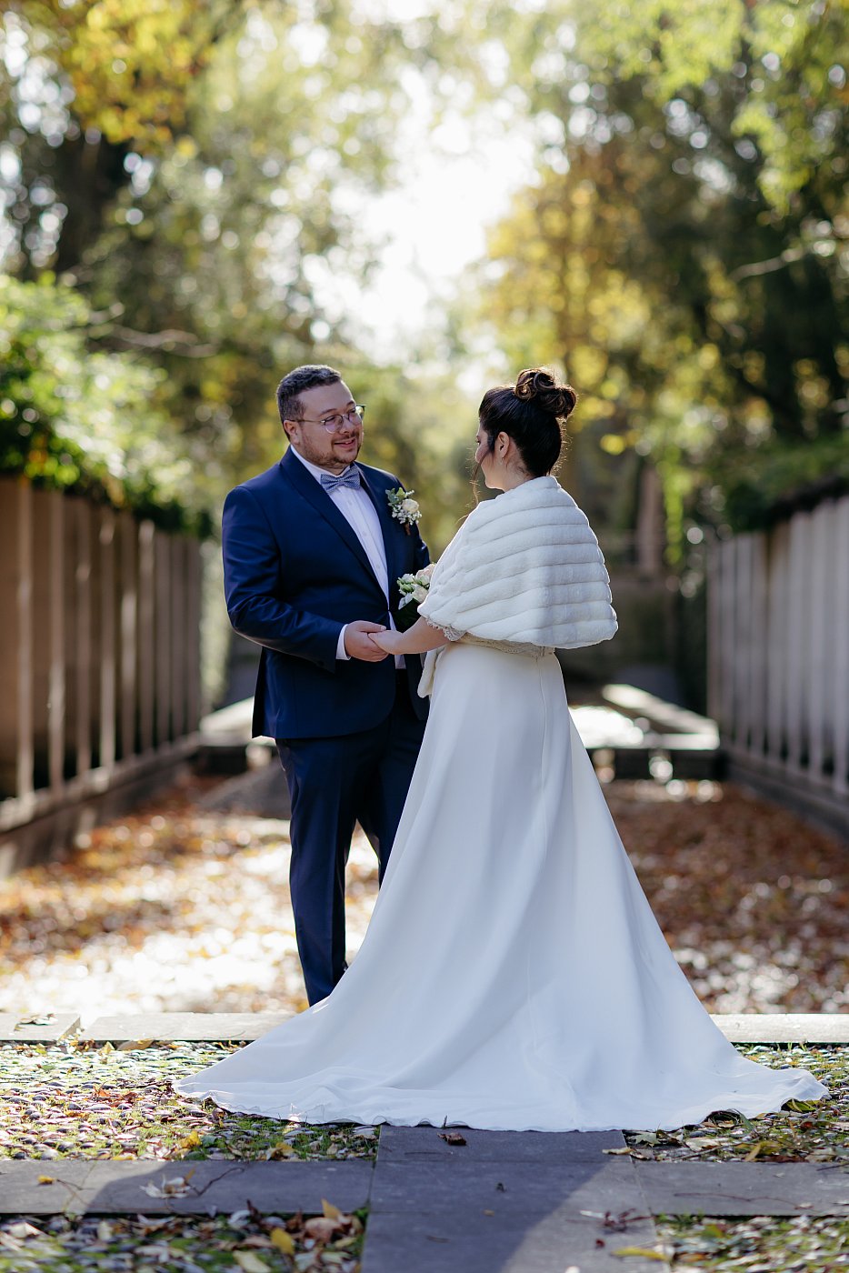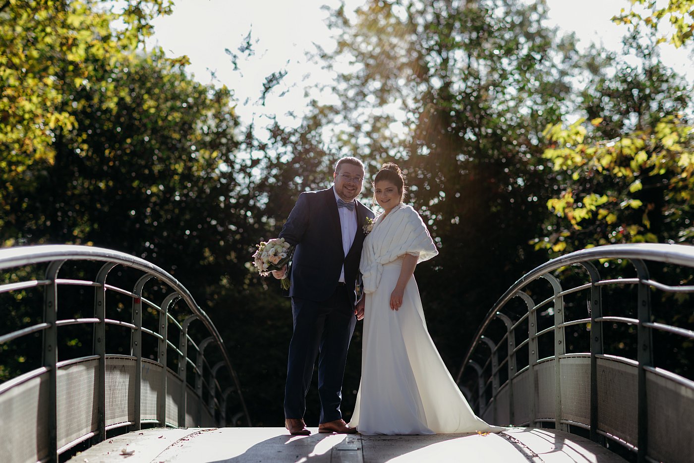Je profite également de la belle lumière pour réaliser des gros plans sur le bouquet et l'alliance de la mariée. Je demande à cette dernière de se placer en bordure du petit pont tout en se positionnant à 90° par rapport au soleil.