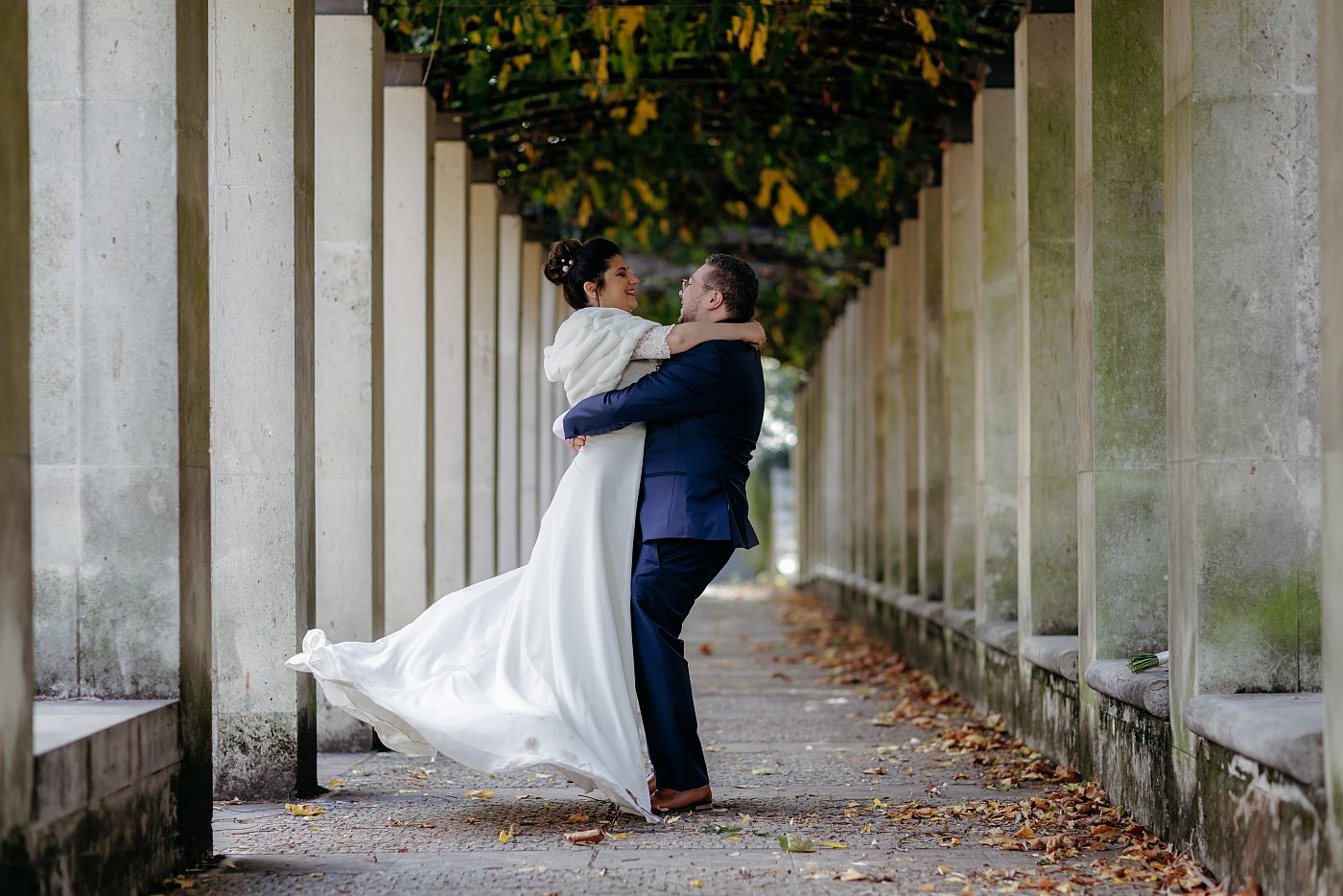 La séance photo de groupe ayant pris fin, les invités rejoignent le lieu de réception tandis que je reste sur place avec nos tourtereaux pour réaliser la séance photo de couple au parc de Bercy.