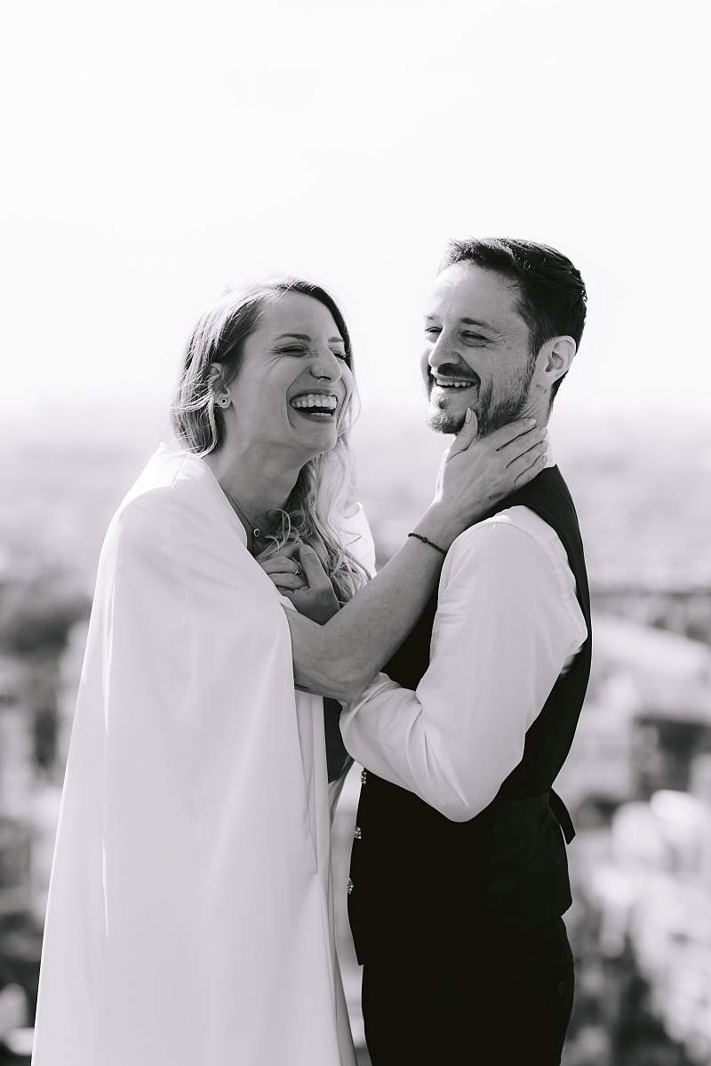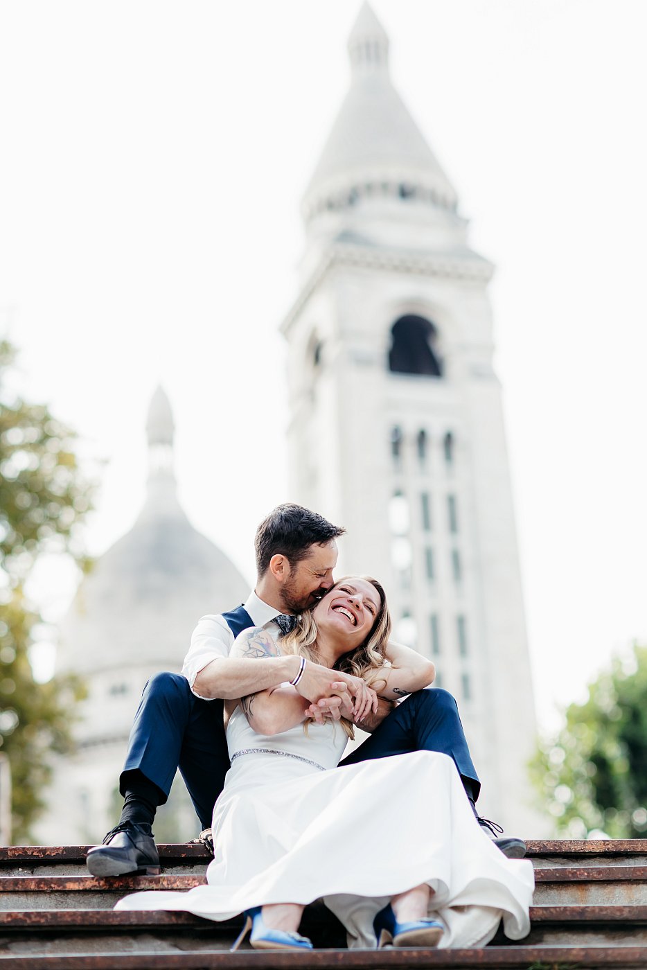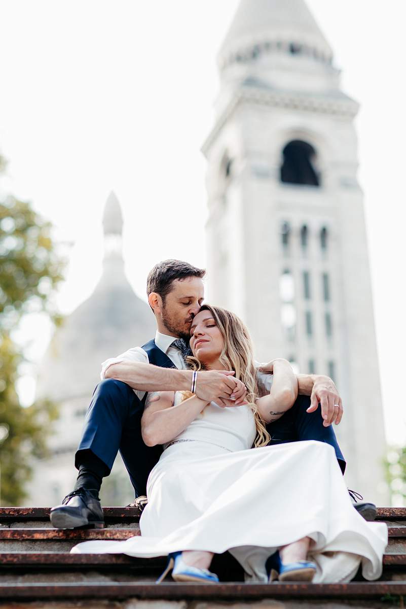 Nous nous positionnons maintenant devant les marches en bas du Sacré-Coeur pour profiter de l'immense vue sur tout Paris (quand on a la chance d'avoir ce genre de décors, je me dis que c'est chouette quand même d'être photographe de mariage Paris 18ème).