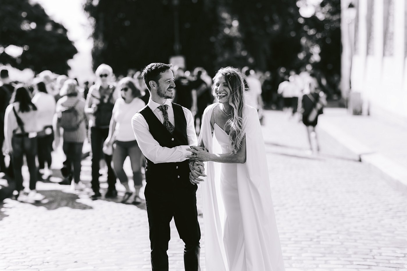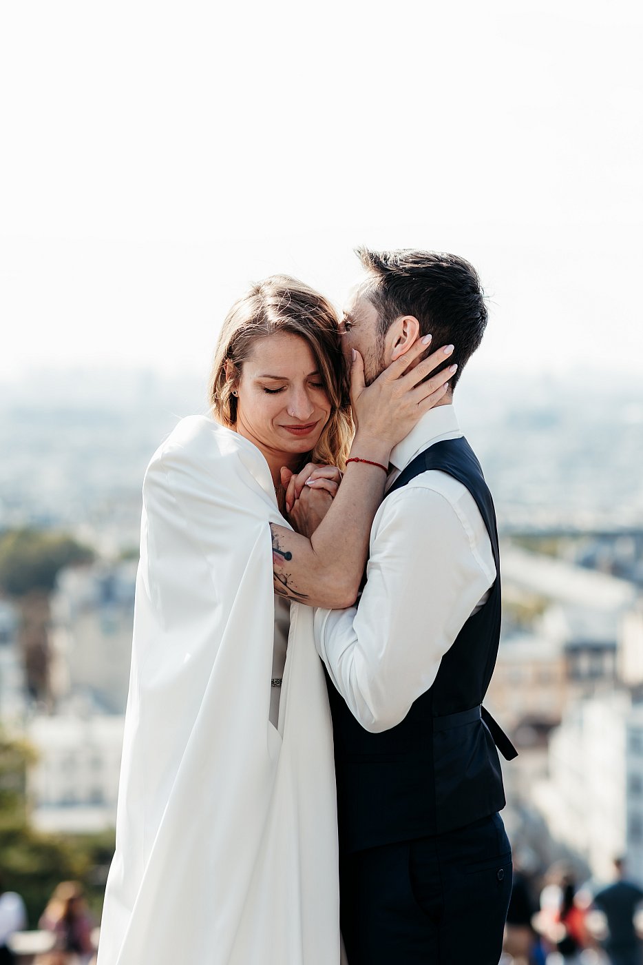 Malgré tout, le jeu en vaut la chandelle : placer le couple à cet endroit bien précis nous permet d'avoir une composition avec le Sacré-Cœur se déroulant majestueusement en arrière-plan.