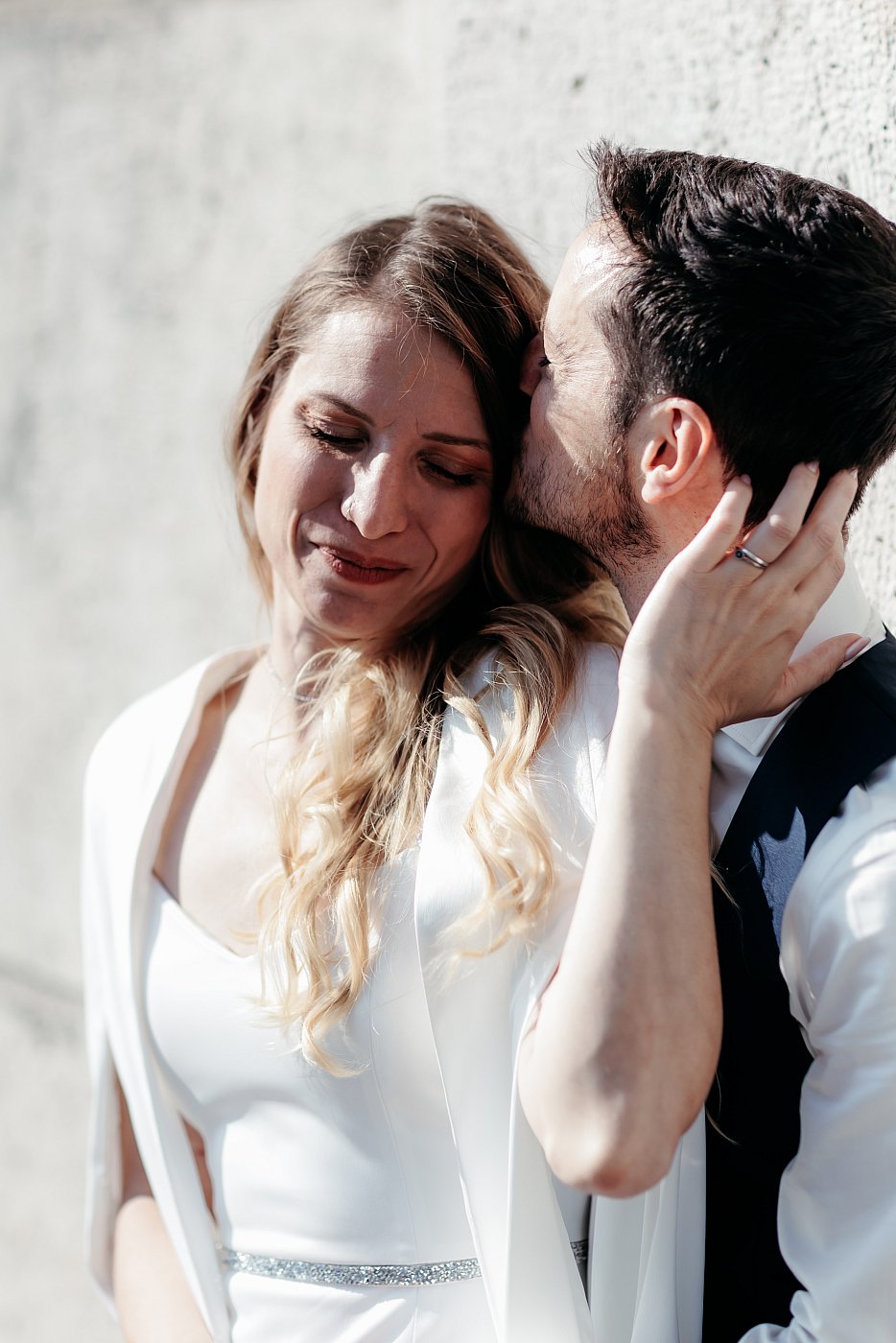 Je demande à "O" de s'adosser au mur tandis que "D" sera devant lui. Ici encore, je vais inviter le couple à partager un petit moment de tendresse. Cela me permet d'obtenir des photos douces et minimalistes mettant admirablement bien en valeur nos amoureux.